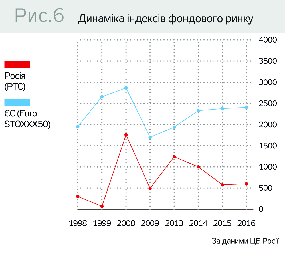 Фондовий ринок Росії просів удвічі, але 2016-го дещо стабілізувався. Тим не менше, втрати позицій фондового ринку більші, ніж за роки кризи 1998 та 2009 рр.. Однак і тут не обійшлось без маніпуляцій. У 2016 р., вперше після введення санкцій, Росія випустила доларові облігації. Кремль хотів засвідчити присутність Росії на світових фінансових ринках, а заразом поповнити бюджет. Проте західні й азійські банки в розміщенні участі не взяли. Це стало приниженням для Росії. Для того, щоб знайти достатню кількість інвесторів, запропонували високу дохідність (відсоток) і продовжили термін розміщення. Планувалося залучити 3 млрд доларів, але коли розміщення, нарешті, сталося, біржі не виявили жодного інтересу.