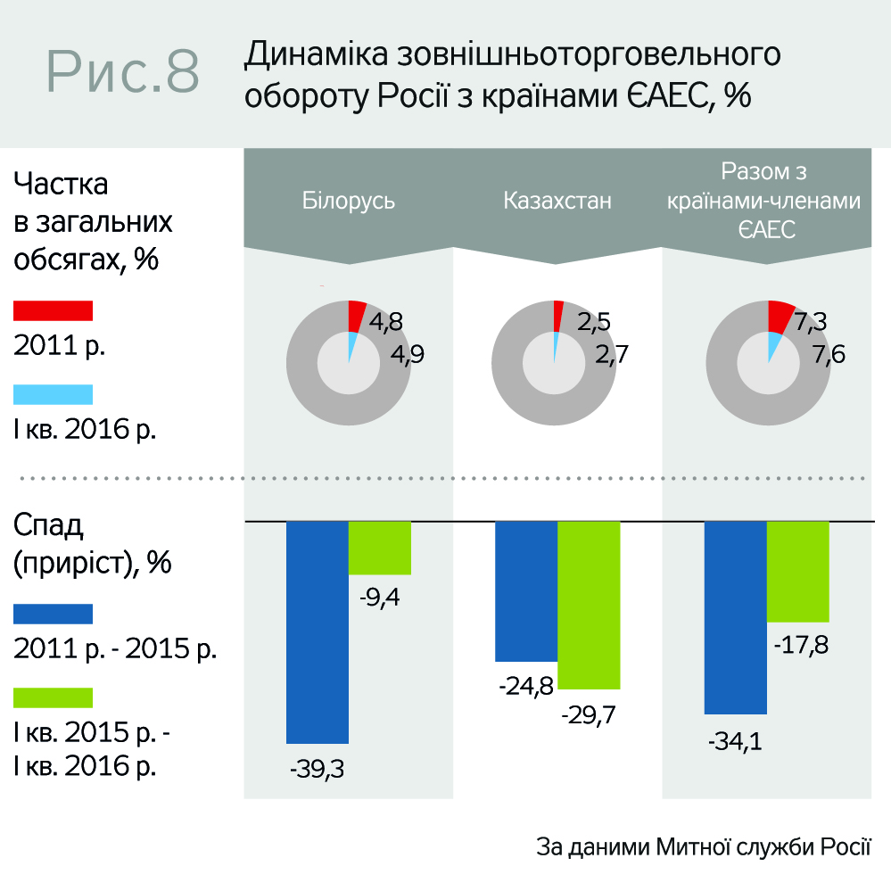 Але найвагомішим аргументом щодо оцінки впливу санкцій ЄС на російську економіку є стан внутрішньої торгівлі між країнами Євразійського (колишнього Митного) союзу. У режимі цієї торгівлі санкцій немає, але торгівля падає і досить суттєво - не менше ніж з ЄС. Про це свідчить статистика. Зокрема в 2015 р. порівняно з 2011-м (початком функціонування Союзу) товарооборот Білорусі з Росією скоротився на 39,3%, Казахстану з Росією - на 24,8%, а в першому кварталі 2016 р. - на 29,7%. При цьому Євразійський економічний союз у цій ситуації не тільки не допомагає Росії, а навпаки - виявився для неї ще одним тягарем.
