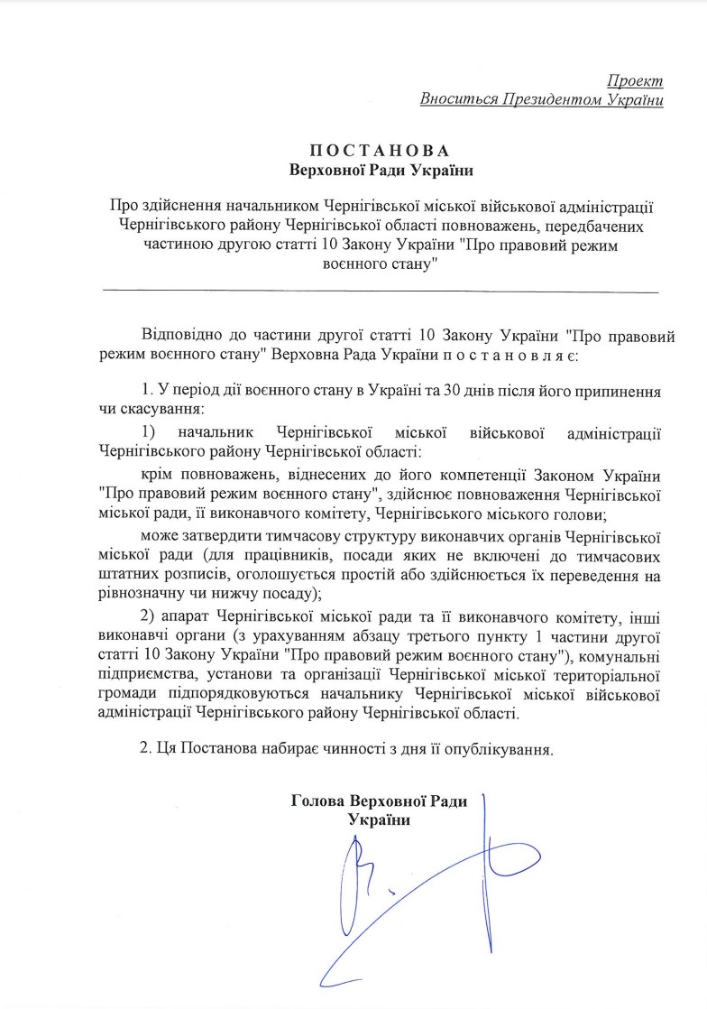 Президент України Володимир Зеленський вніс у Верховну Раду України постанову, якою пропонує передати всі повноваження з управління містом Черніговом під контроль Чернігівсьої міської військової адміністрації, що по суті ліквідує будь-яке місцеве самоврядування в місті.
