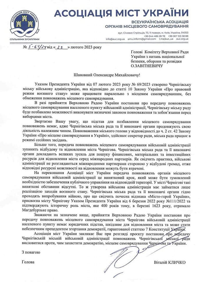 «Передача повноважень органів місцевого самоврядування військовій адміністрації це винятковий крок, який може бути зумовлений необхідністю забезпечення публічного управління на відповідній території. У місті Чернігові такі виняткові обставини відсутні. То ж утворена військова адміністрація має займатися лише реалізацією заходів воєнного стану», - зазначено у листі.