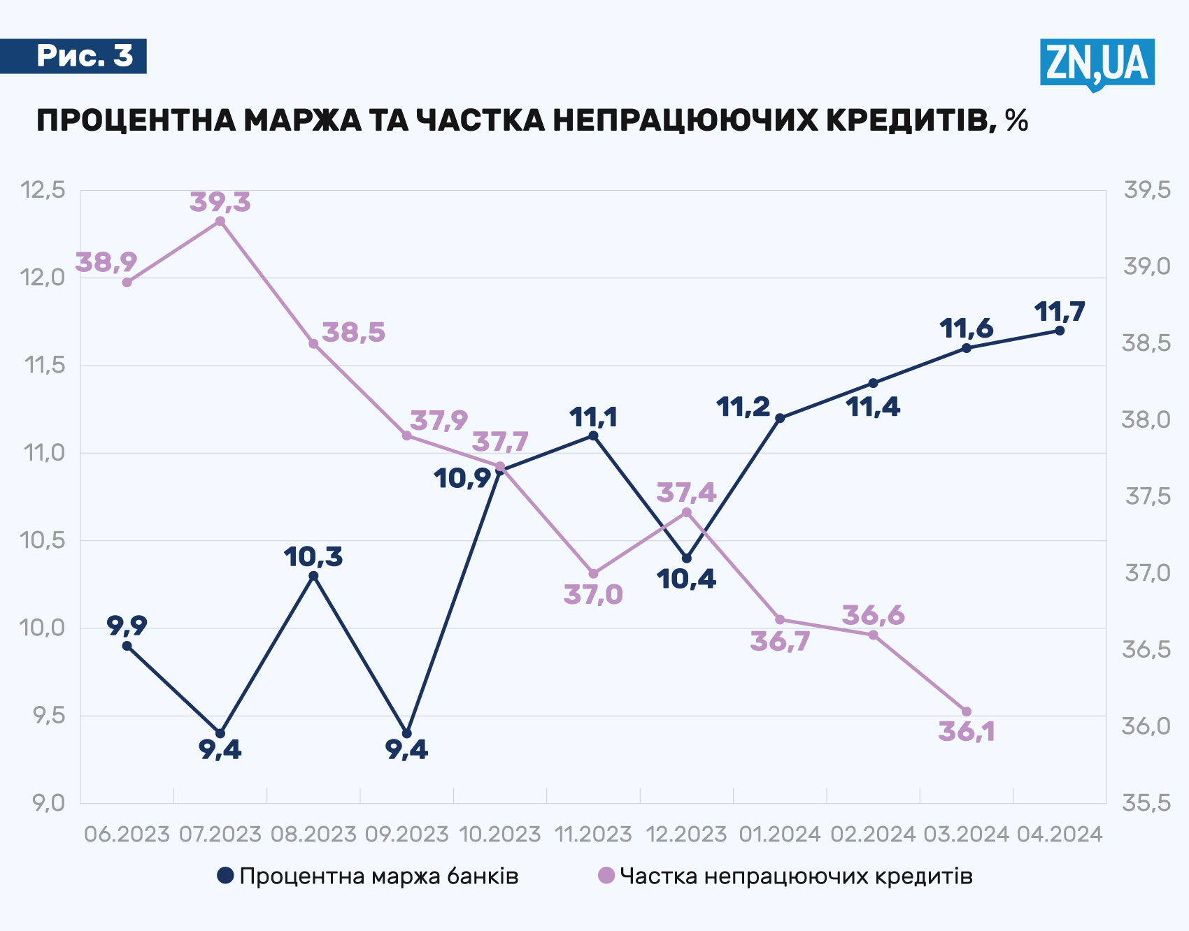 При цьому процентна маржа банків між ставками за новими кредитами та новими депозитами сягає гігантських розмірів — 11,7 п.п. у квітні 2024 року. Це в чотири рази перевищує інфляцію.