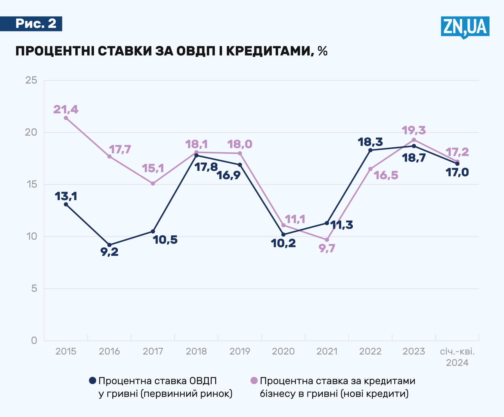 З 2018 року середня процентна ставка нових розміщень ОВДП майже збігалася із середньою ставкою гривневих бізнес-кредитів, а в окремі періоди — навіть перевищувала її (див. рис. 2).
