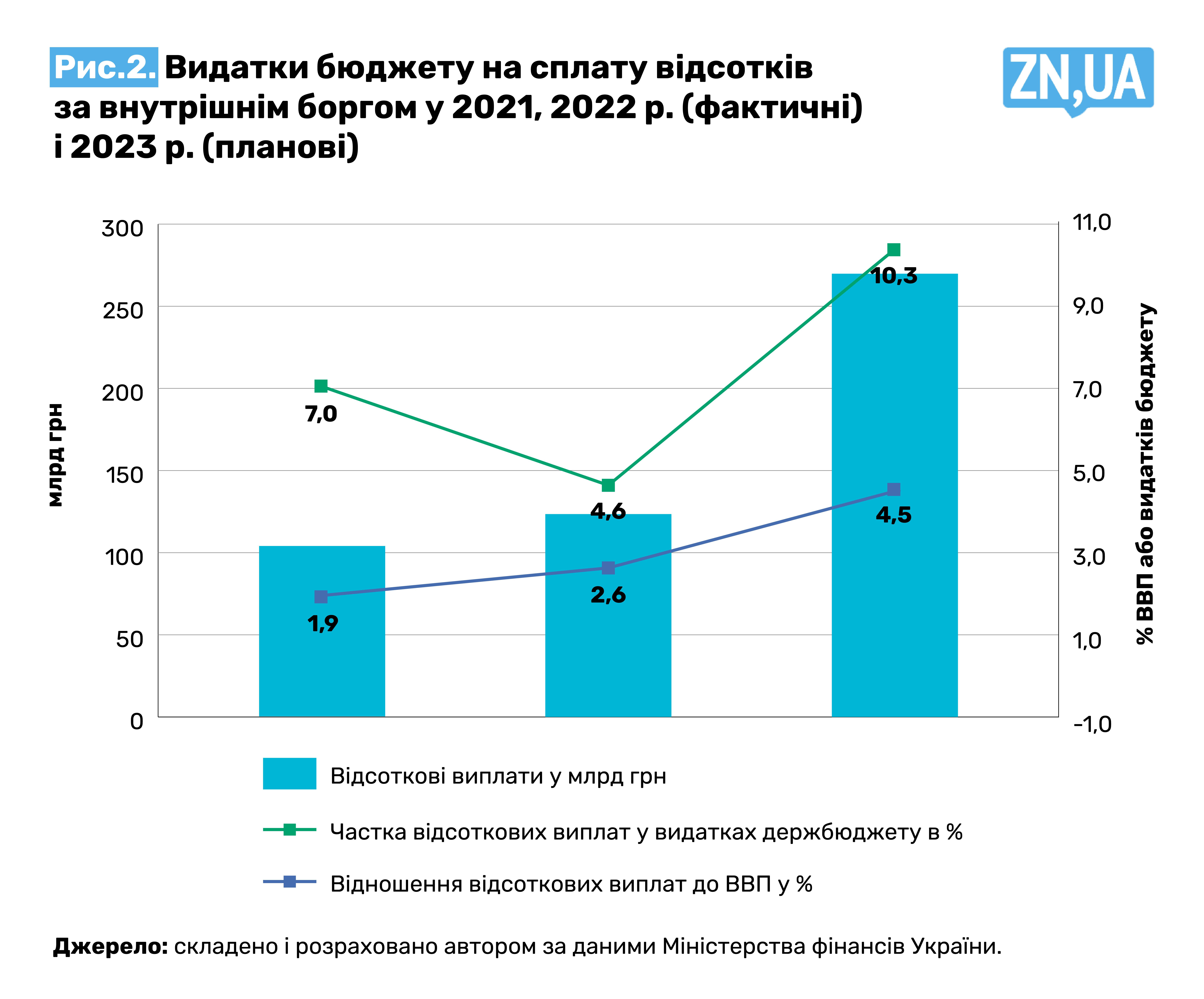 У результаті переходу до «ринкових» джерел фінансування видатки бюджету на сплату відсотків за внутрішнім боргом номінально мають зрости більш як удвічі: із 123,5 млрд грн у 2022 році до 269,8 млрд у 2023-му. У видатках державного бюджету частка відсоткових виплат за внутрішнім боргом має різко збільшитися: із 4,6 до 10,3% (див. рис. 2). Відношення відсоткових виплат за внутрішнім боргом до ВВП орієнтовно збільшиться з 2,6% у 2022-му до 4,5% у 2023 році.
