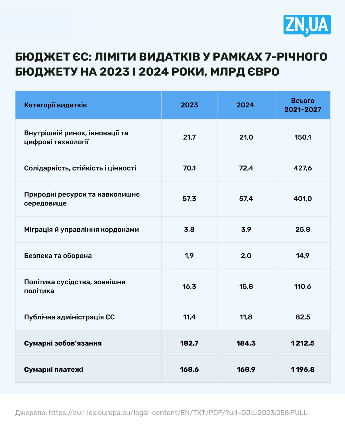 Поточний бюджет ЄС визначено багаторічною фінансовою програмою (MFF) на 2021–2027 роки. Річні видатки бюджету ЄС у 2023 і 2024 роках трохи перевищуватимуть 168 млрд євро (див. табл.). Політика економічної, соціальної та територіальної солідарності ЄС є найбільшою статтею витрат із бюджету Союзу: 2023 року за цим напрямом буде використано 62,9 млрд євро.