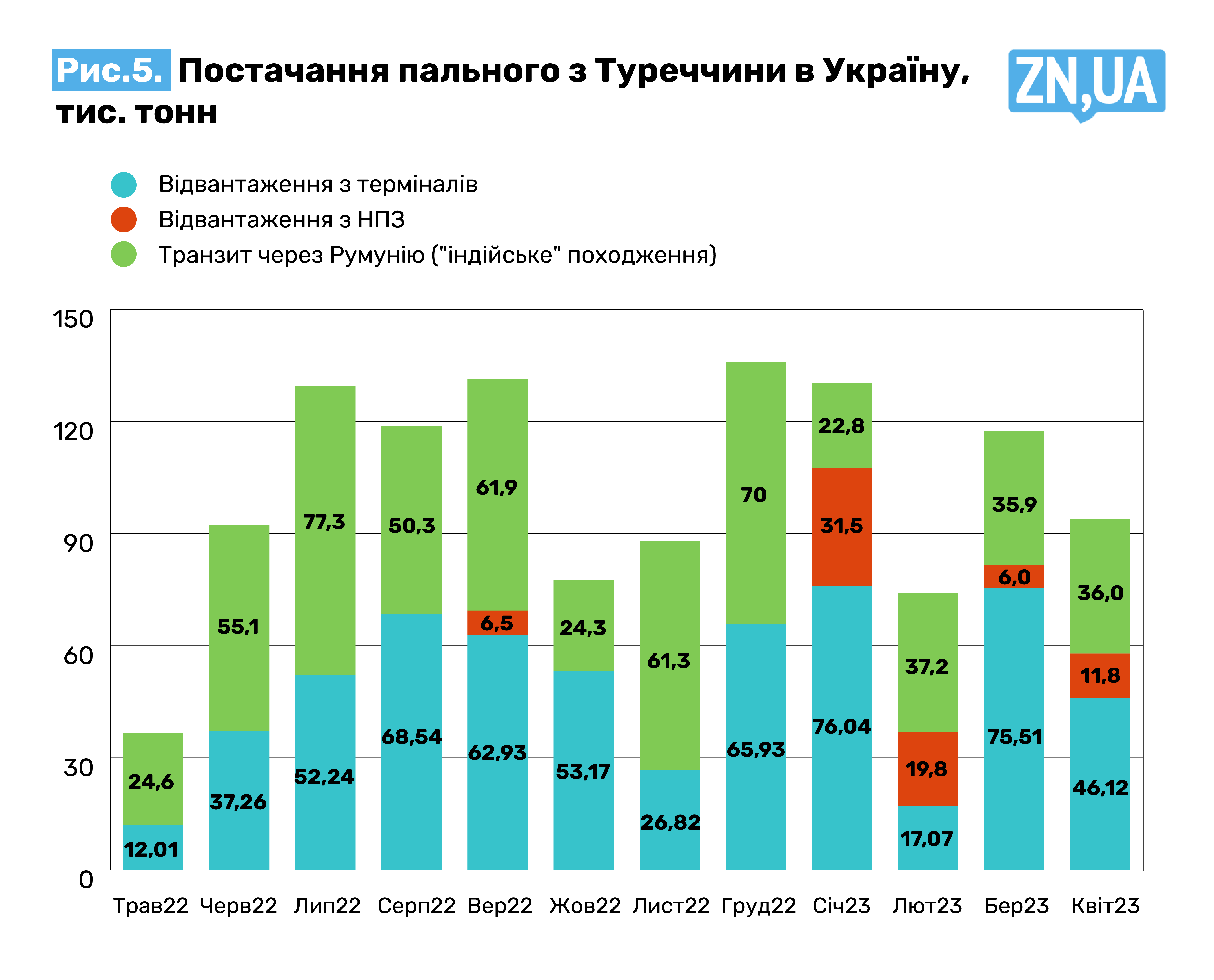 Акумулюючи величезні обсяги ДП з Росії та Індії, що практично повністю перейшла на російську нафту, Туреччина стала найбільшим хабом у Чорноморському та Середземноморському регіонах. Причому турецькі порти також здатні приймати величезні 100-тисячні танкери з Індії, чого не можуть робити румунські чи болгарські термінали. Згідно з даними Інституту статистики, за перший квартал 2023 року через турецькі термінали транзитом пройшло близько 550 тис. тонн дизпалива, більша частина якого — в Україну та Румунію, звідки, знову-таки, левова частка пішла в Україну (див. рис. 5).