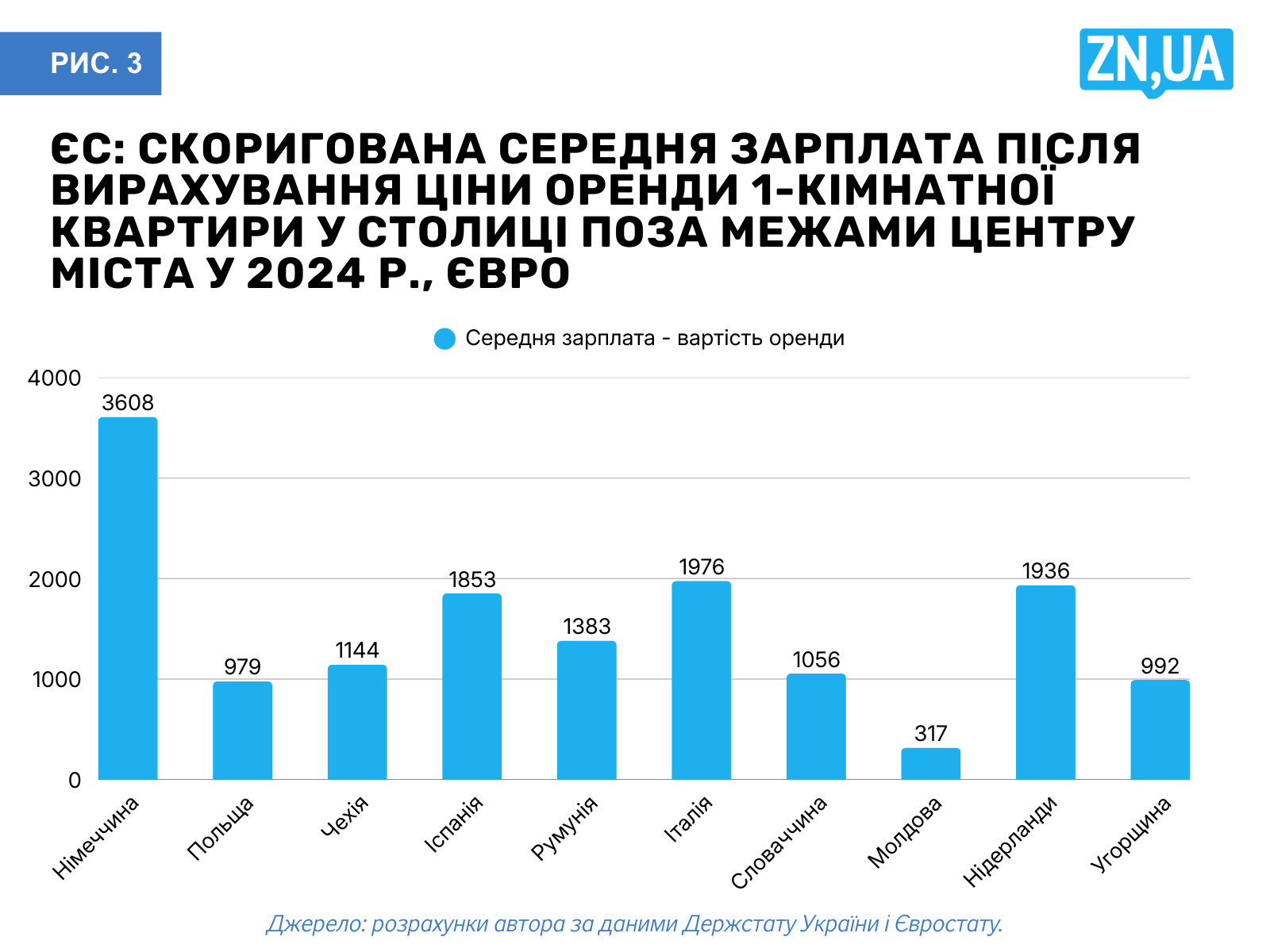 Отримані дані вказують на те, що в країнах Східної Європи — членах ЄС — вартість оренди вказаної квартири варіювалася від 376 євро в Бухаресті та 546 євро в Будапешті до 792 євро у Варшаві і 856 євро у Празі. Найвищим рівнем орендної плати відзначалися Мадрид (955 євро) і Амстердам (1730 євро). Отримані дані щодо середньої зарплати, скоригованої на вартість оренди житла, в досліджуваних країнах ЄС і Молдові наведено на рис. 3.