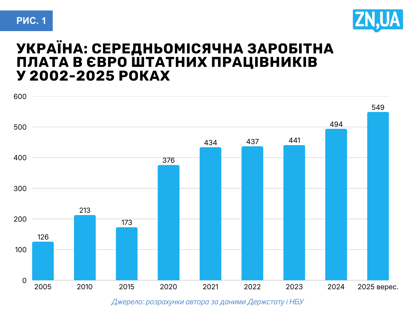 На жаль, в Україні і до повномасштабної війни рівень заробітних плат був дуже низьким (див. рис. 1). Так, середньомісячна заробітна плата штатних працівників в Україні при конвертації в євро становила 434 євро 2021 року і 549 євро у вересні 2025-го.