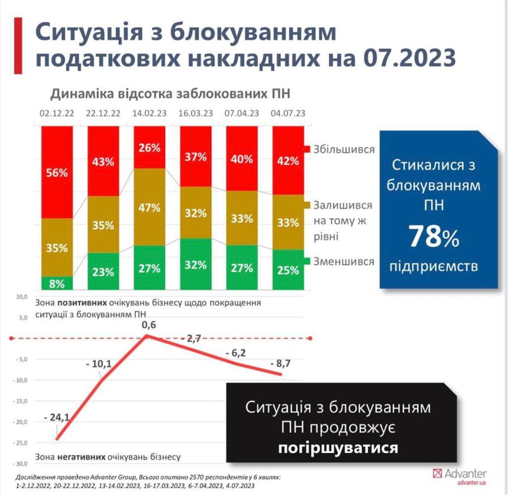 В Україні погіршилася ситуація з податковими накладними (ПН): станом на 4 липня з блокуванням цих документів стикалися 78% підприємств, свідчать результати дослідження аналітиків Advanter Group, яке з початку грудня регулярно проводилось серед 2570 респондентів.