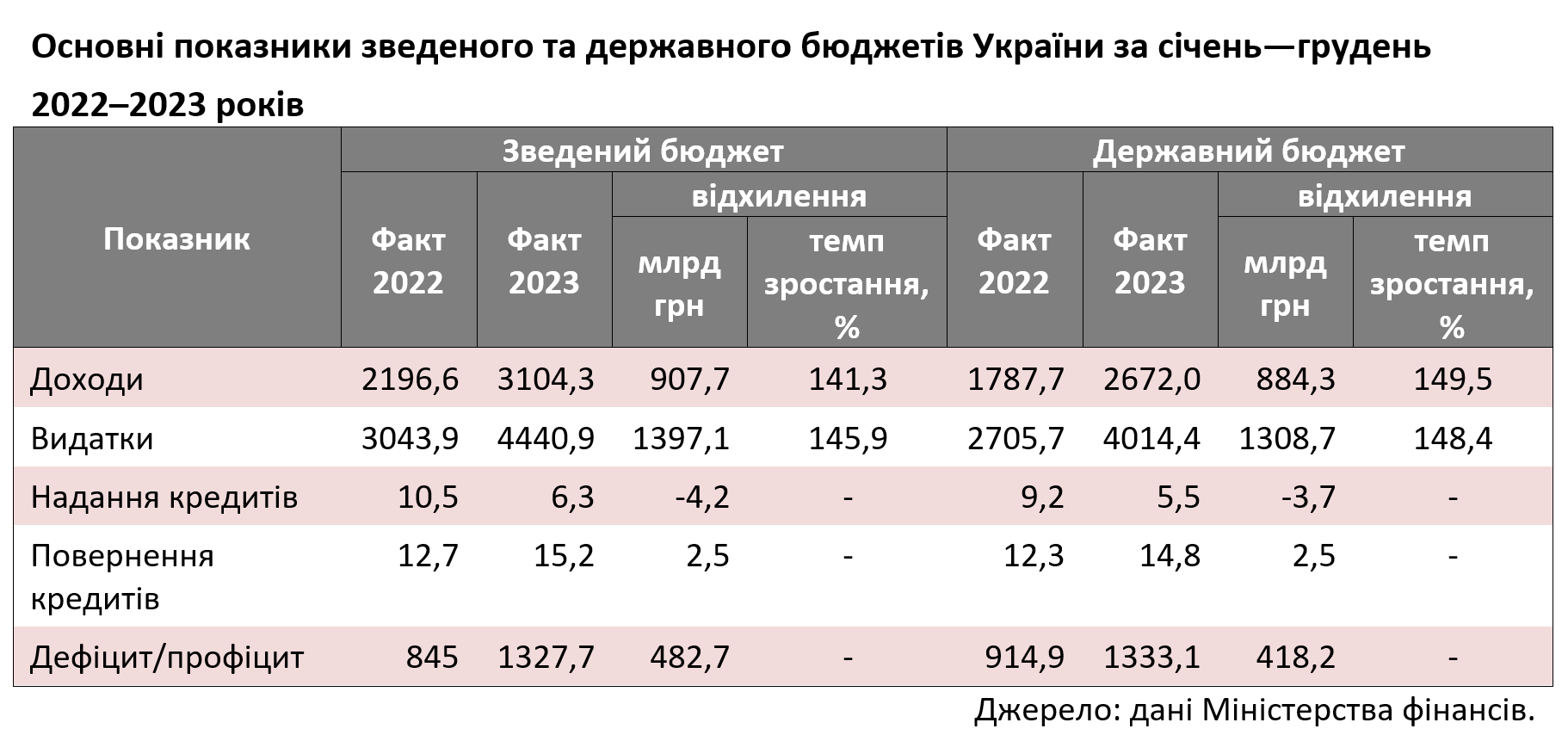 У зведеному бюджеті надходження доходів 2023 року порівняно з 2022-м зросли на 908 млрд грн, або на 141%: з 2,2 трлн до 3,1 трлн грн із одночасним розширенням бюджетного дефіциту на 483 млрд грн (з 845 млрд до 1,33 трлн грн).