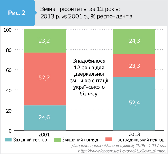 У період з 1998-го по 2017 р. частка прихильників західного, європейського, вектора економічної інтеграції серед українського бізнесу поступово зростала. Так, у 2001 р. вона становила вже чверть опитаних "Ділової думки", в 2004-му - майже третину, а в 2005 р. більш як третина респондентів "Ділової думки" вважали, що єдиним пріоритетом економічної інтеграції України має бути європейський або західний.