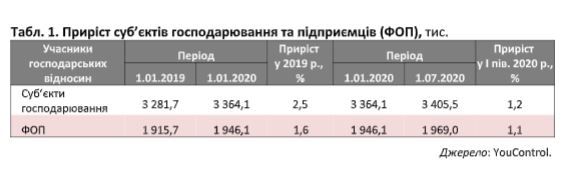 Попри запроваджені карантинні заходи, падіння промислового виробництва та валового внутрішнього продукту, в Україні продовжують реєструватися нові підприємства та підприємці. Понад те, їхня кількість продовжує зростати і 2020 року, хоча динаміка все-таки трохи сповільнилася. Якщо 2019 року, за даними аналітичної системи YouControl, кількість суб’єктів господарювання збільшилася на 2,5%, а підприємців — на 1,6%, то в першому півріччі 2020-го число суб’єктів господарювання, так само, як і підприємців, зросло трохи більше як на 1% (див. табл. 1). Словом, погіршення економічної ситуації в країні несуттєво вплинуло на рішення відкрити в Україні свій бізнес.