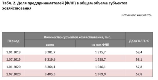 Статистичні дані підтверджують першість ФОПів. За даними аналітиків YouControl, частка ФОПів у загальному обсязі суб’єктів госпдіяльності становить близько 58% (див. табл. 2). При цьому майже 2 мільйони зареєстрованих фізосіб-підприємців (1915,7 тис.) щорічно поповнюють держбюджет лише на 25 млрд грн податків, тобто кожний платить у середньому 13 тис. грн на рік. За даними Держстату, ФОП — найпоширеніша форма суб’єктів госпдіяльності в Україні, на яку припадає близько 80% у загальному обсязі. Різницю в оцінках аналітики YouControl пояснюють відмінністю методик підрахунку, але при цьому переконують, що тенденція зберігається: ФОПів більше, ніж інших суб’єктів госпдіяльності.