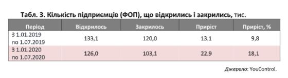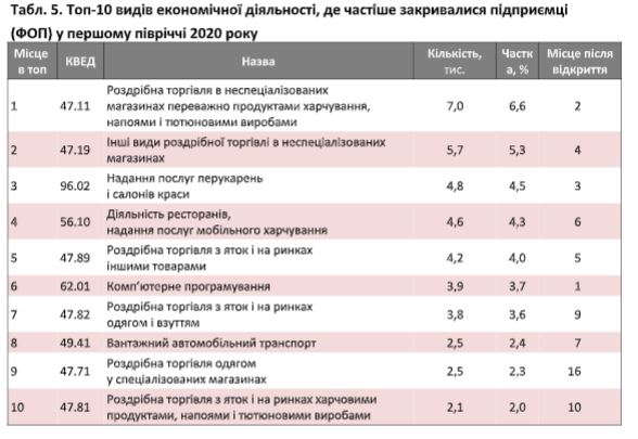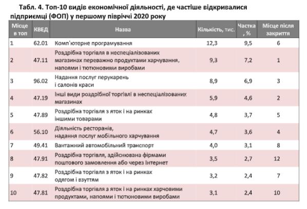 Однак, попри вищесказане, новий бізнес в Україні все-таки відкривається. І «улюбленими» галузями ФОПів стають IT-індустрія, роздрібна торгівля, послуги, а також сфера громадського харчування. За даними аналітичної системи YouСontrol, у першому півріччі 2020-го на частку «програмерів» припадало 9,5% ФОПів, що відкрилися (див. табл. 4). І закриваються вони набагато рідше за інші.