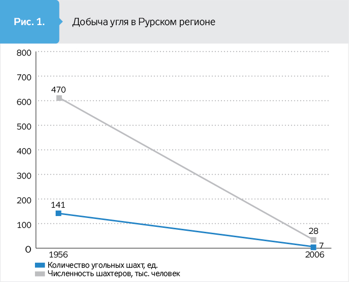 Результати докорінних структурних змін в економіці Рурського регіону проілюстровано графічно (див. рис. 1–3). Цифри говорять самі за себе - за 50 років кількість шахт, які вели видобуток вугілля в регіоні, скоротилася в 23,5 разу, а чисельність шахтарів зменшилась у