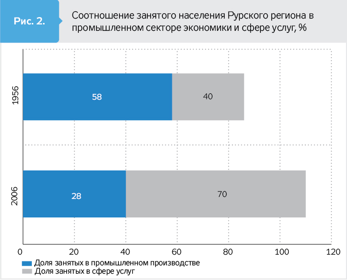 16,8 разу. Кардинально змінилося співвідношення зайнятих у промисловості та сфері послуг: у 2005 р. на вугільних і металургійних підприємствах, разом узятих, працювало трохи більше 60 тис. осіб проти 720 тис. осіб у 1957-му. Індустріальний Рур перетворився на справжній центр знань, технологій і послуг.