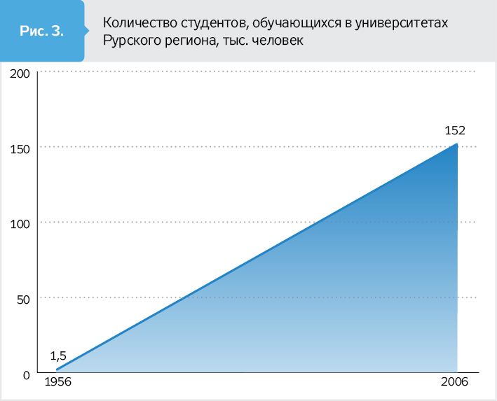 На тлі скорочення кількості вуглевидобувних підприємств значно збільшилася кількість освітніх установ. І це враховуючи, що до 1963 р. у регіоні не було жодного університету, University of Bochum став першим. Сьогодні Рурський регіон вирізняється високою щільністю освітніх закладів: у його межах діє більш як 20 університетів, в яких навчається понад 150 тис. осіб, що у сто разів більше, ніж 1956-го.