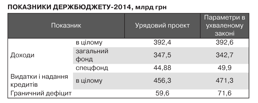Остаточної версії держбюджету-2014 після обробки його в профільному комітеті на момент підготовки цього матеріалу ще не оприлюднили. Разом з тим, згідно з даними Мінфіну, депутати збільшили дефіцит держскарбниці на 12 млрд грн (до 4,3% ВВП). Плановані доходи зросли лише на 0,2 млрд грн, а видатки та обсяг надання кредитів - на 15 млрд (див. табл.). У висновку бюджетного комітету парламенту до документа (його поправки, як зазначалося, враховано при його ухвалення) передбачалося збільшити граничний розмір держборгу на 4,4 млрд грн (до 584,5 млрд).