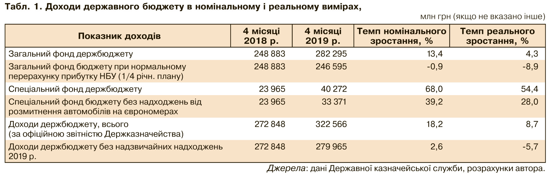 Якщо скоригувати суму доходів держбюджету за чотири місяці на обсяги тимчасових надходжень від розмитнення автомобілів і аномального вилучення прибутків НБУ (тобто відняти ¾ суми трансферу від НБУ), то величина доходів бюджету зменшиться з 322,6 млрд грн до 280 млрд. У такому разі темп номінального приросту доходів бюджету становитиме 2,6% відносно аналогічного минулорічного періоду, а темп реального приросту буде від'ємним (-5,7%). Така динаміка реальних доходів бюджету помітно контрастує із динамікою реального ВВП України, який збільшився у І кварталі 2019 року на 2,2%.