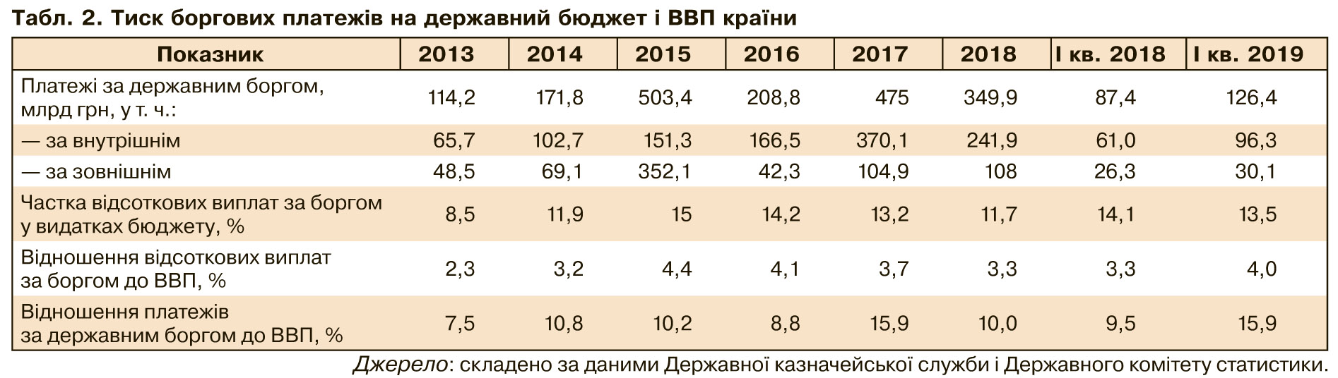 Видатки на обслуговування держборгу в першому кварталі 2019-го становили 32,1 млрд грн, або 4% ВВП, збільшившись на 0,7 п.п. ВВП відносно аналогічного минулорічного періоду. Загальний обсяг виплат з погашення та обслуговування боргу у січні-березні 2019 р. сягнув 15,9% ВВП проти 9,5% ВВП у першій чверті 2018-го. У табл. 2 наведено основні показники навантаження боргових виплат у період 2013 р. - першого кварталу 2019-го.
