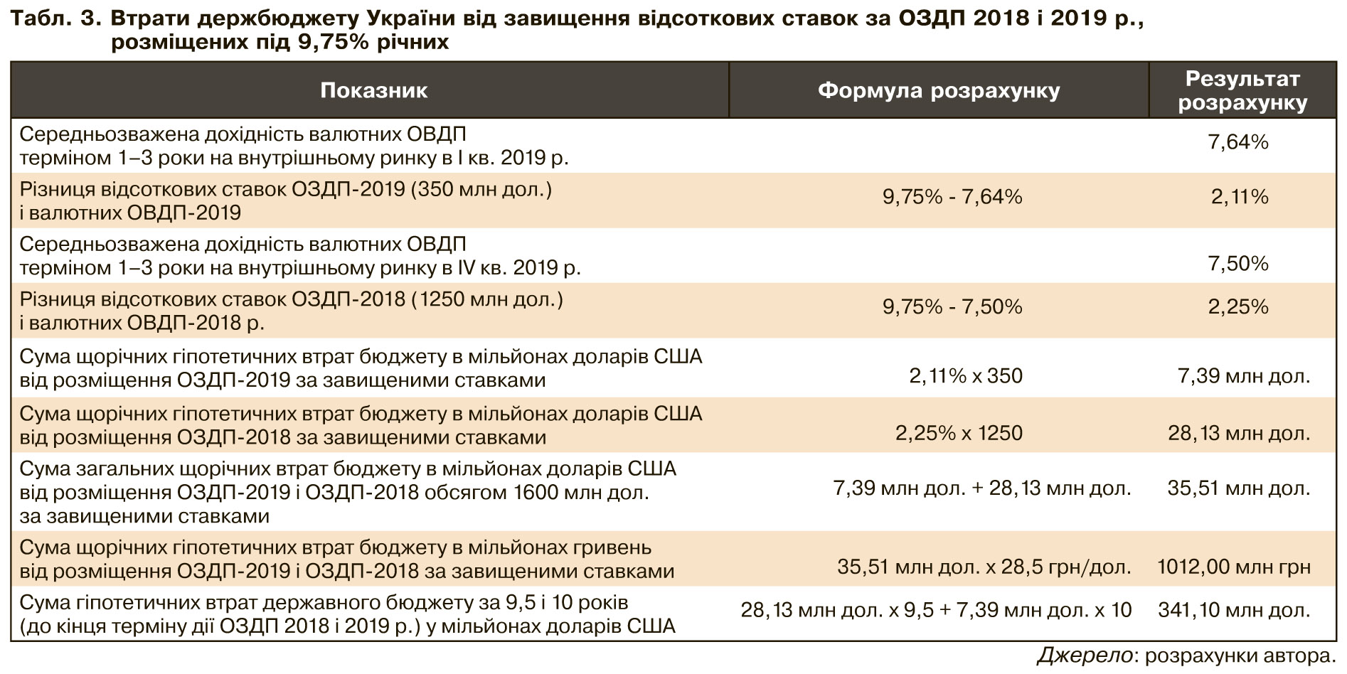 Отримані результати вказують на те, що березнева позика 2019 р. стала причиною невиправданих втрат держбюджету на суму 7,4 млн дол. на рік. Єврооблігаційна позика жовтня 2018-го також призвела до невиправданих втрат бюджету на суму 28,1 млн дол. на рік. До кінця терміну дії кожної з облігаційних позик під 9,75% річних масштаби таких втрат зростають до 341,1 млн дол. Щорічно держбюджет змушений буде витрачати понад 1 млрд грн на оплату завищених відсоткових ставок за двома зовнішніми позиками 2018–2019 рр. (на додаток до оплати ставок на рівні 7,5–7,64% річних).