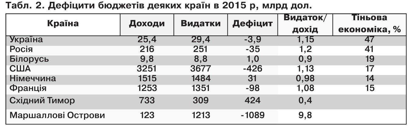Однак позики в нас нарощуються. Тож чому це робиться? Хтось, може, особисто зацікавлений у такій політиці? Почасти ті, хто пов'язаний з тіньовою економікою. З табл. 2 видно, що Україна та Росія люблять "сидіти в тіні", маючи так званий неформальний сектор економіки більш як 40% ВВП і (не)пристойний дефіцит держфінансів. А от Білорусь, у якої тіньовий сектор менш як 20% ВВП, обходиться своїми грошима, маючи, як ми вже зазначали, профіцитний бюджет. Щоправда, з "тінню" у світі не все цілком ясно - США та Франція, маючи невелику "тінь", люблять позики, а от Німеччина, з якої можна та потрібно брати приклад, зводить свій держбюджет із профіцитом. Профіцитний бюджет мають також такі країни, як Східний Тимор, Маршаллові Острови. Але їх можна не брати до уваги - дуже маленькі, хоча й "спритненькі".