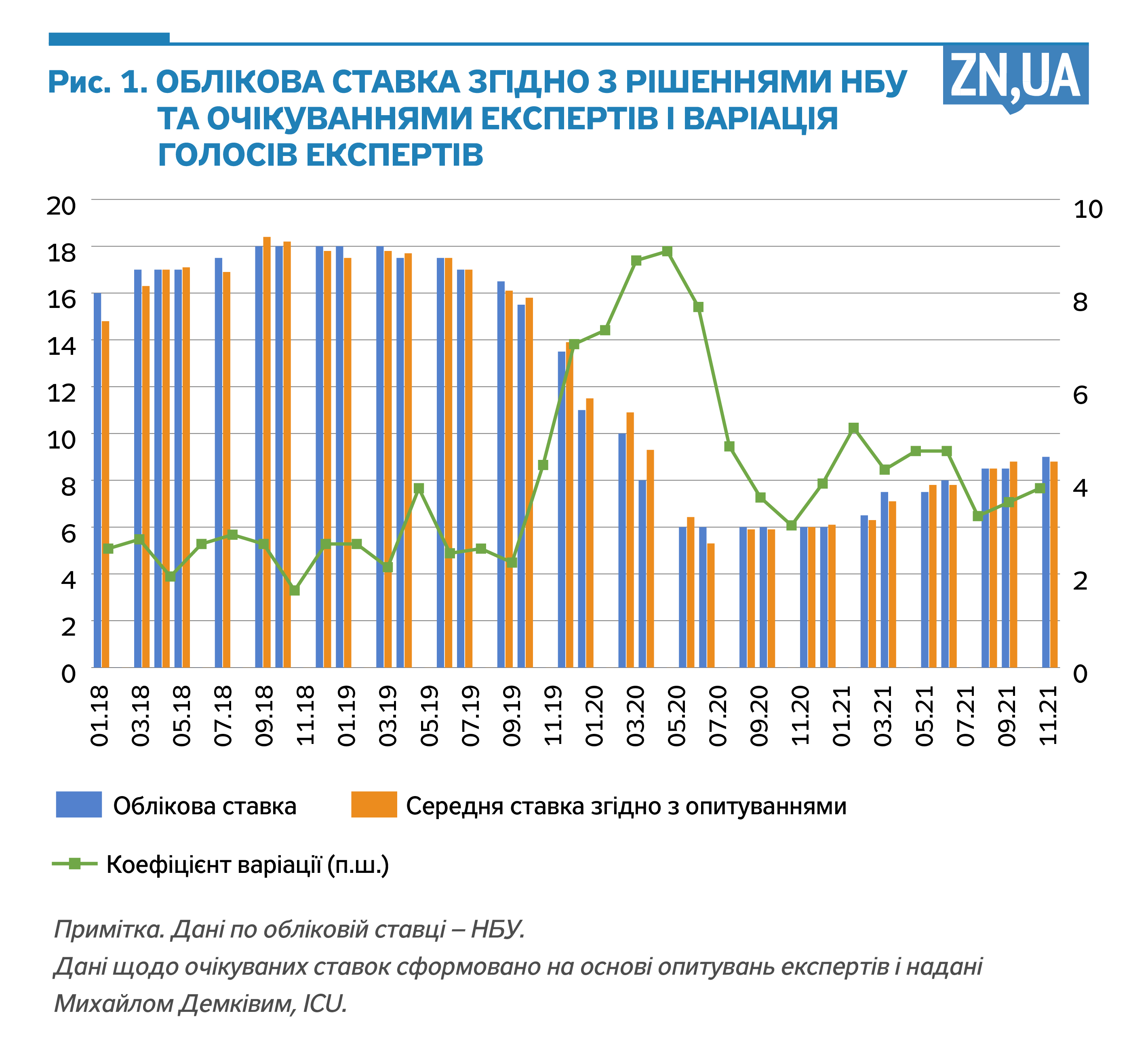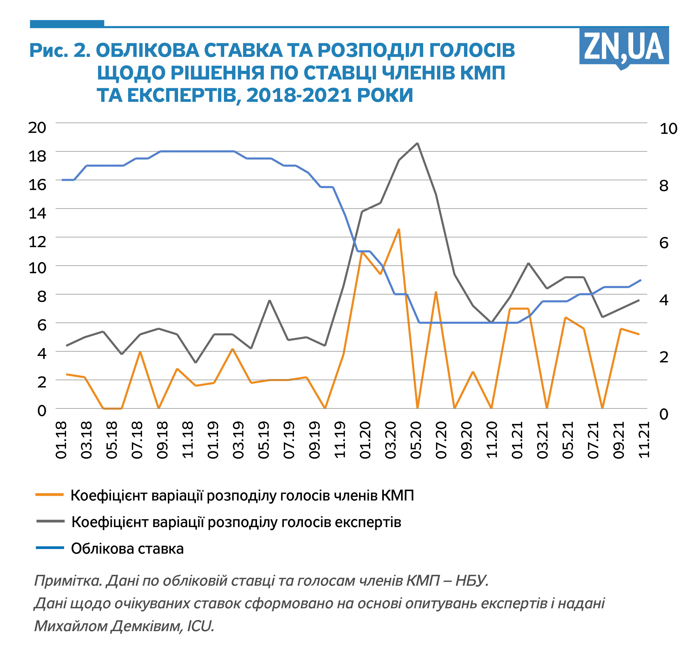 Реакцією на невизначеність при здійсненні політики є підвищення ступеня «незгоди», або ж зростання варіації голосів за той чи інший варіант рішення. Аналогічно економічні агенти реагують на невизначеність. На рис. 2 показано динаміку варіації голосів членів комітету з монетарної політики (КМП) НБУ та експертів щодо рішення по ставці, при цьому продемонстровано те, наскільки невизначеність, з якою стикаються полісімейкери, корелює з невизначеністю щодо їхніх дій.