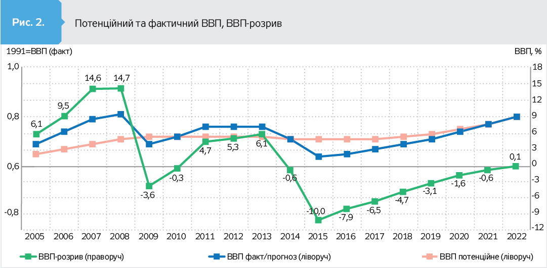 По-перше, в умовах перебування економіки нижче потенційного рівня (від'ємний ВВП-розрив спостерігатиметься до 2022 р.) жорстка фіскальна політика стане обмежуючим фактором для економічного зростання. Зниження реального ефективного обмінного курсу та вирівнювання торгового балансу створили передумови для зростання мультиплікатора державних видатків.