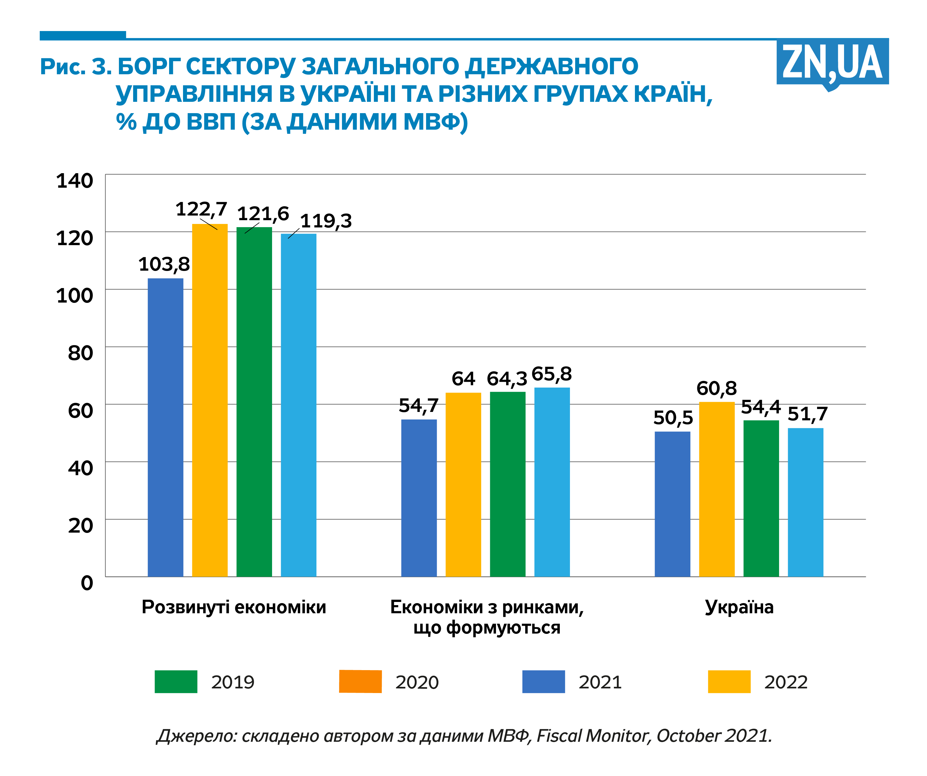 В Україні ж державний борг становитиме лише 54,4% ВВП. Тобто серед країн з ринками, що формуються, український борг відставатиме від середнього майже на 10 в.п. ВВП.