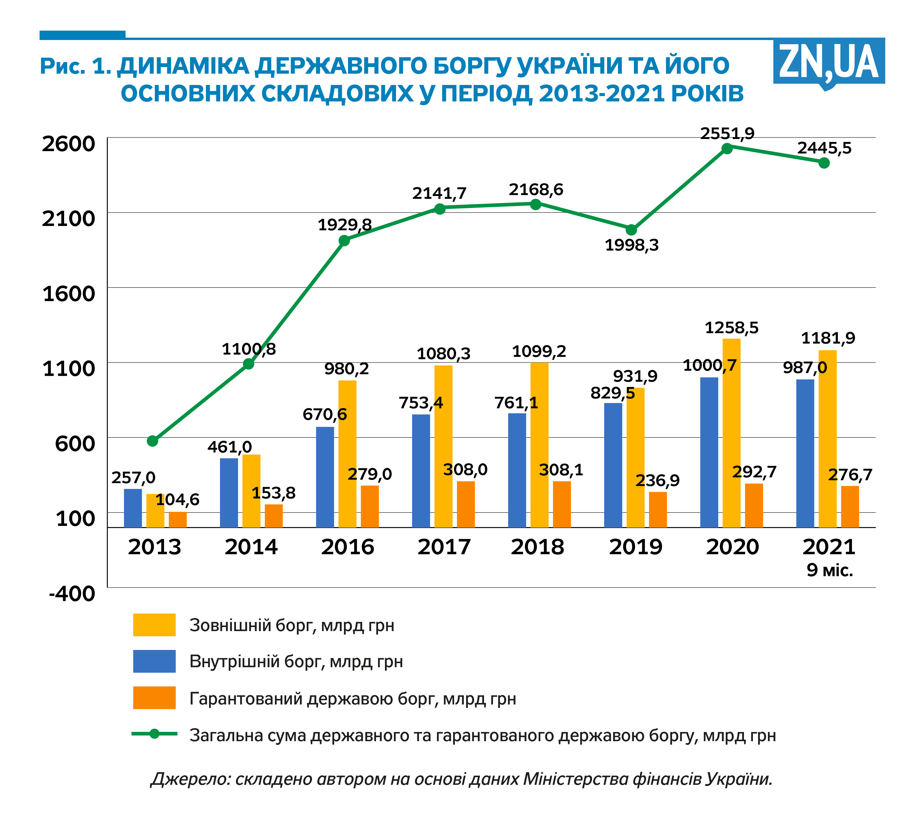 Відносно 2020 року динаміка більшості боргових індикаторів у 2021-му була сприятливою. За січень—вересень загальна сума державного і гарантованого державою боргу зменшилася на 106,4 млрд грн і досягнула 2,45 трлн. Причому відбувалося зменшення як внутрішнього державного боргу (на 0,9 млрд грн), так і зовнішнього (на 0,5 млрд дол. США) (див. рис. 1). Рівень боргових ризиків цьогоріч також почав знижуватися.