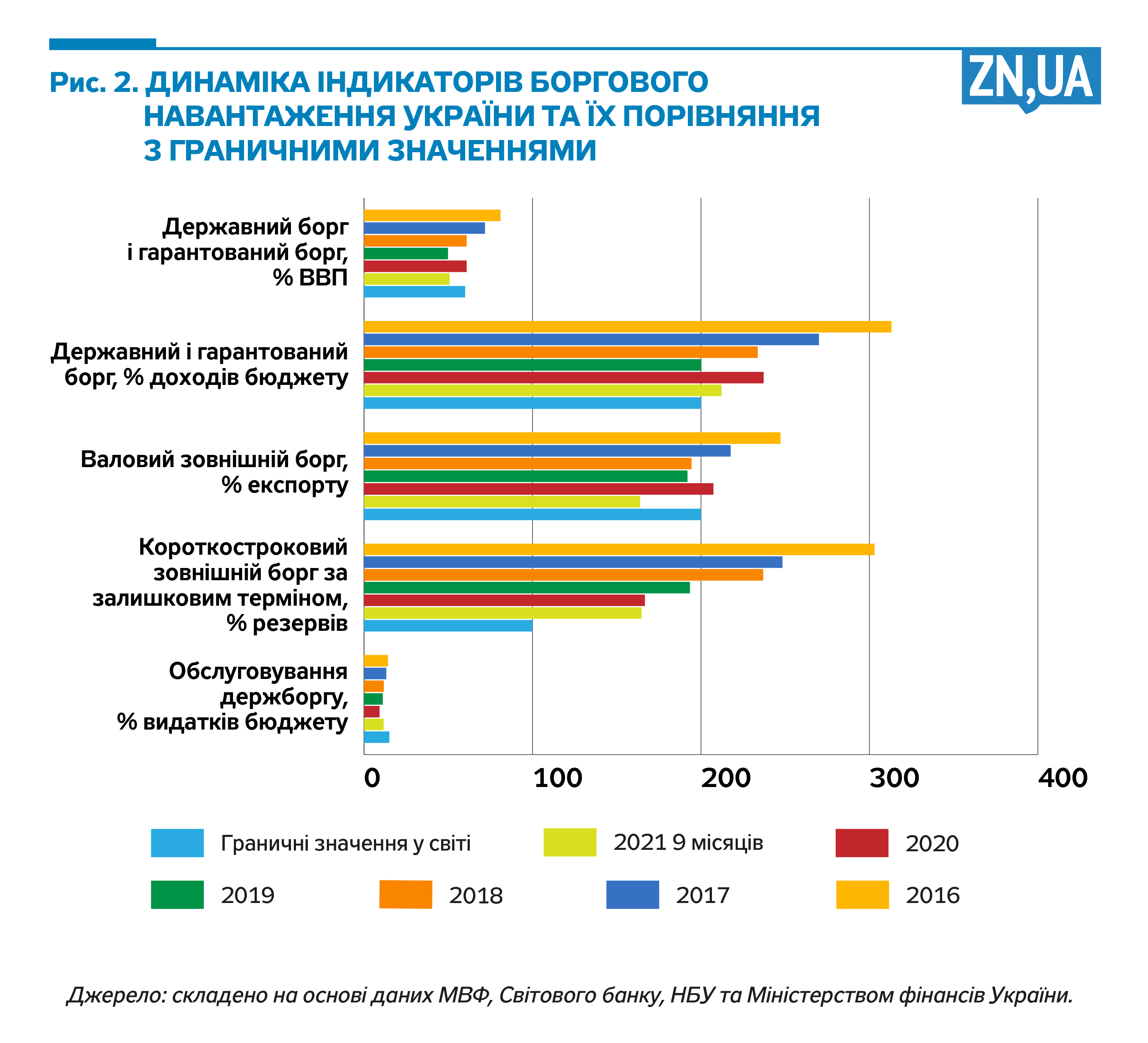 Показово, що з початку епідемічної та економічної криз стрімке зростання державного боргу мало місце в багатьох країнах. За даними МВФ, упродовж 2020–2021 років середній рівень державного боргу в світі має зрости на 14,2% ВВП. При цьому в розвинених країнах приріст державного боргу сягатиме 17,8% ВВП. А в Україні приріст боргу за 2020–2021 роки становитиме лише 3,9% ВВП.