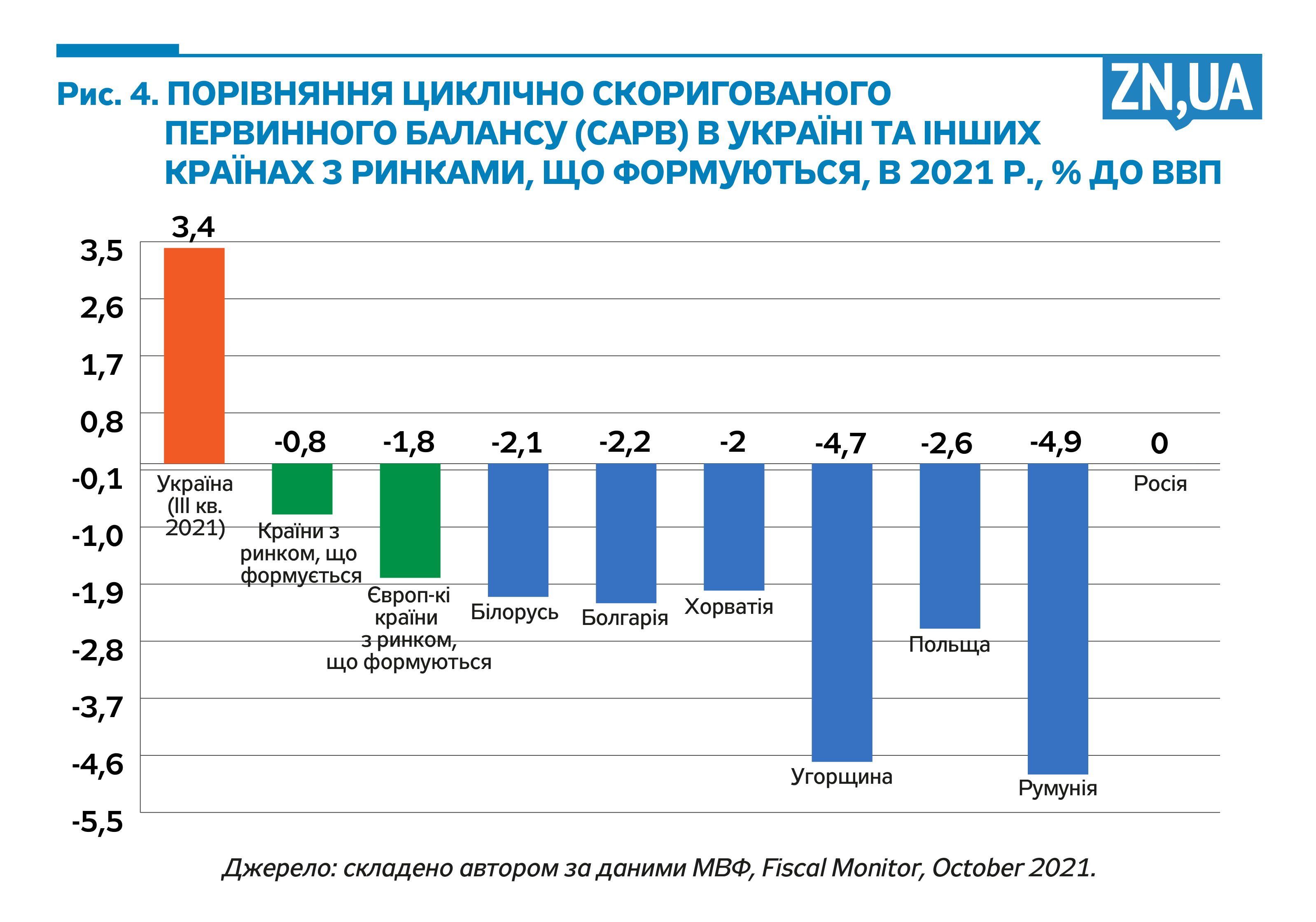Український циклічно скоригований первинний баланс кратно перевищує середній показник у країнах з ринками, що формуються (-0,8% ВВП), і в європейських країнах з ринками, що формуються (-1,8%). Це сигналізує про надмірну жорсткість фіскальної політики України у міжнародному вимірі. На рис. 4 наведено порівняння цього показника в Україні з показниками країн-сусідів.