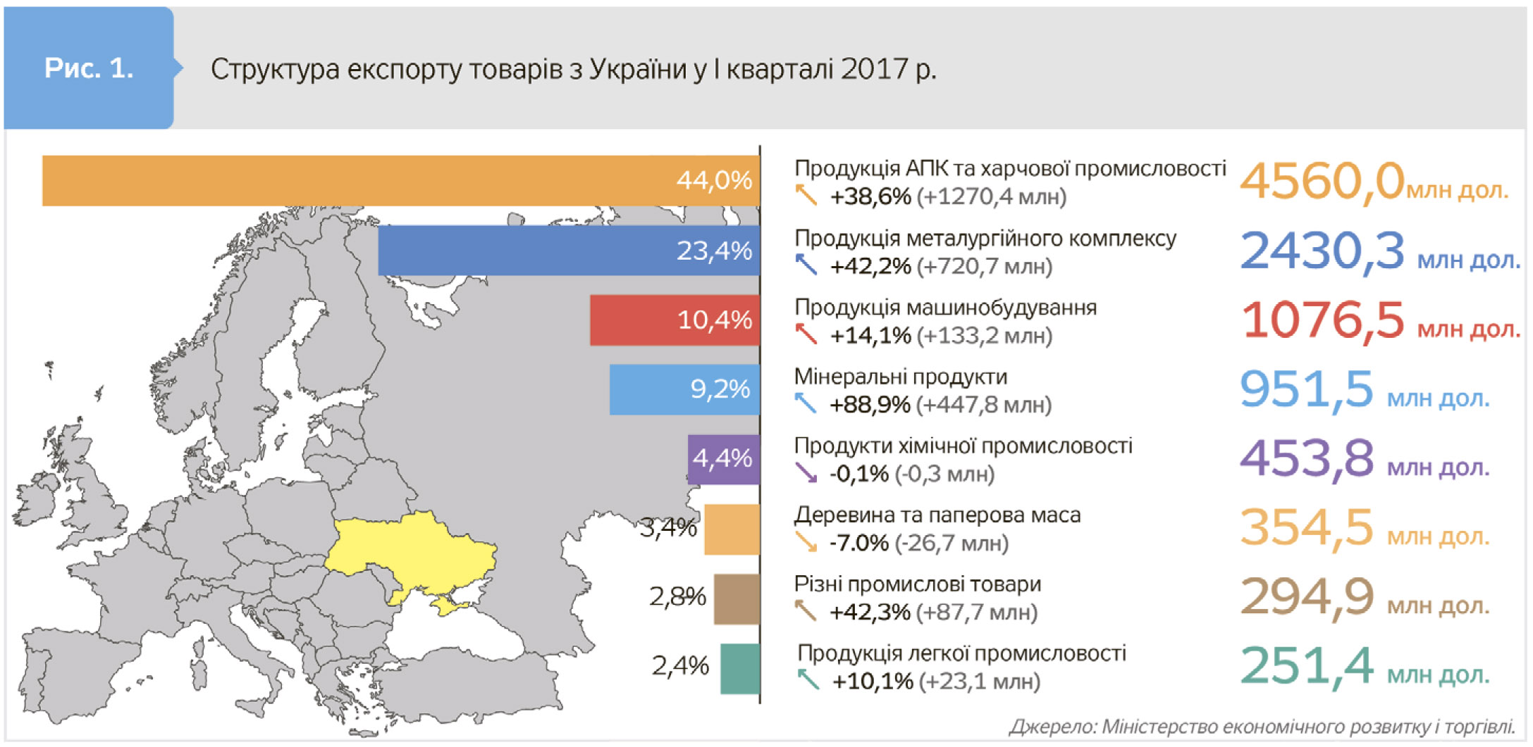 У першому кварталі ц.р. обсяг українського експорту товарів і послуг становив 12,4 млрд дол., що на 2,7 млрд більше, ніж роком раніше. У структурі експорту товарів найбільшу частку становила продукція АПК і харчової промисловості (44%), металургії (23,4%), машинобудування (10,4%), а також мінеральні продукти (9,2%). Що цікаво, незважаючи на блокаду Донбасу, зростання обсягів експорту товарів демонстрували майже всі галузі економіки, за винятком деревообробної та хімічної. Щоправда, якщо аналізувати конкретні товари, то картинка менш оптимістична, бо продаємо ми виключно сировину і напівфабрикати - плоский прокат, залізну руду, соєві боби, кукурудзу, пшеницю, ячмінь. З відносно готових продуктів - хіба що соняшникова олія і цукор (див. рис. 1 на 6-й стор.).