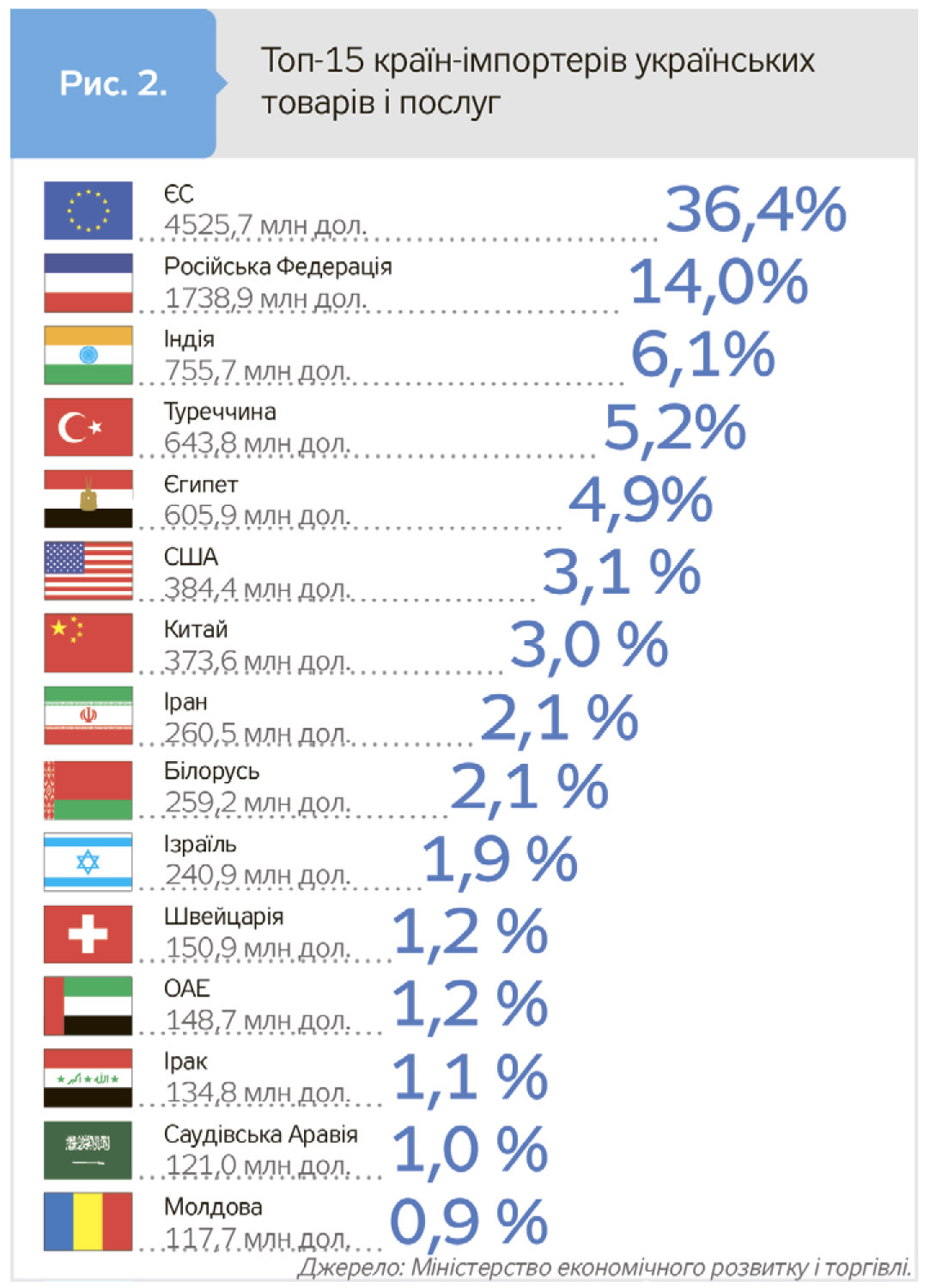 Проте експорт товарів у країни ЄС демонструє стійку позитивну динаміку. І за підсумками першого кварталу 2017-го (відносно аналогічного періоду 2016-го) його обсяг зріс на 782,3 млн дол. (+24,5%). Окрім країн ЄС, до групи торгових партнерів, які нарощують імпорт українських товарів (див. рис. 2 на 6-й стор.), увійшли також: Індія (на 353,8 млн дол.), Росія (на 284,6 млн.), Туреччина (на 177,7 млн), Іран (на 146,2 млн), Єгипет (на 136,0 млн), США (на 125,4 млн), Ізраїль (на 106,1 млн).