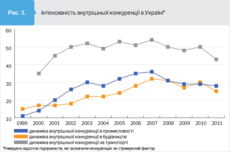 Статистичні органи України регулярно проводять опитування керівників підприємств, з'ясовуючи фактори, що стримують виробництво. Серед них - висока конкуренція з боку вітчизняних підприємств. Частка керівників підприємств, які зазначають цей фактор, на наш погляд, відображає інтенсивність внутрішньої конкуренції. Підприємці не дуже люблять конкуренцію, але вона - типове суспільне благо, яке змушує їх підвищувати ефективність, впроваджувати інновації.