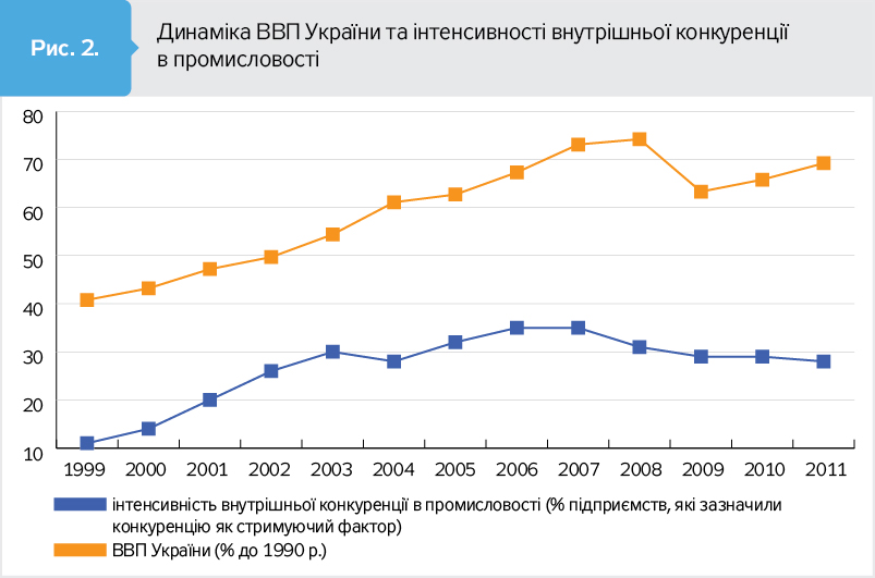 Саме посилення конкуренції стало, на наш погляд, найважливішою рушійною силою підйому, що розпочався у 2000 р. Це підтверджують дані про динаміку інтенсивності внутрішньої конкуренції й ВВП, наведені на рис. 2. На зазначеному рисунку відображено дані про конкуренцію в промисловості, але, як видно на рис. 1, її динаміка в найважливіших галузях близька.