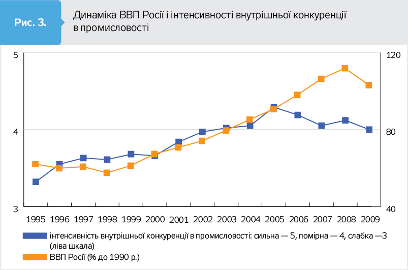 Цікаво, що багато в чому подібною була ситуація й у Росії. Загальновідома залежність економіки цієї країни від цін на енергоресурси. Але світові ціни на них почали зростати в 2004 р., а підйом у РФ почався 1999-го. Моніторинг конкурентного середовища в промисловості здійснює Інститут Гайдара. Дані про динаміку інтенсивності внутрішньої конкуренції й ВВП наведено на рис. 3. На ньому видно, що конкуренція почала посилюватися в Росії вже в середині 1990-х, оскільки там раніше, ніж у нас, провели ринкові реформи. Відповідно, меншим було падіння виробництва (у нижчій точці кризи ВВП Росії становив 57,5% від рівня 1990 р., тоді як ВВП України - 40,8%), раніше почався підйом. Максимального рівня конкуренції було досягнуто у 2005 р., після чого пішло зниження. Коли прийшли нафтодолари, конкуренцію почали активно утискати. Значною мірою через це після кризи 2008–2009 рр. темпи економічного зростання в Росії суттєво знизилися порівняно з докризовим періодом, хоча світові ціни на енергоресурси залишалися високими аж до 2014 р.