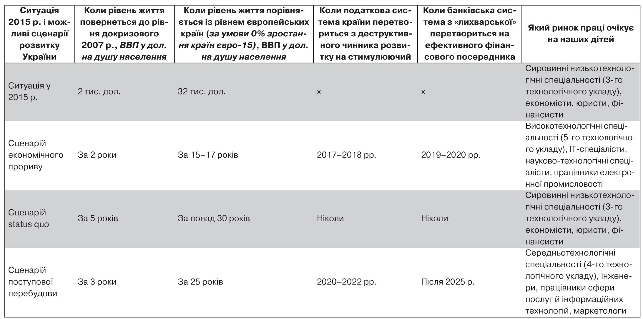 Однак тепер для всіх важливо чітко розуміти, що ж нас чекає у майбутньому? Коли розпочнеться відновлення економіки? Коли рівень життя населення хоча б повернеться до докризового рівня, не кажучи вже про те, коли він зрівняється з рівнем європейських країн? Коли податкова система країни перетвориться з деструктивного чинника розвитку на стимулюючий? Коли банківська система з "лихварської" перетвориться на ефективного фінансового посередника? Який ринок праці очікує на наших дітей і які професії (виробництва) стануть драйверами розвитку?