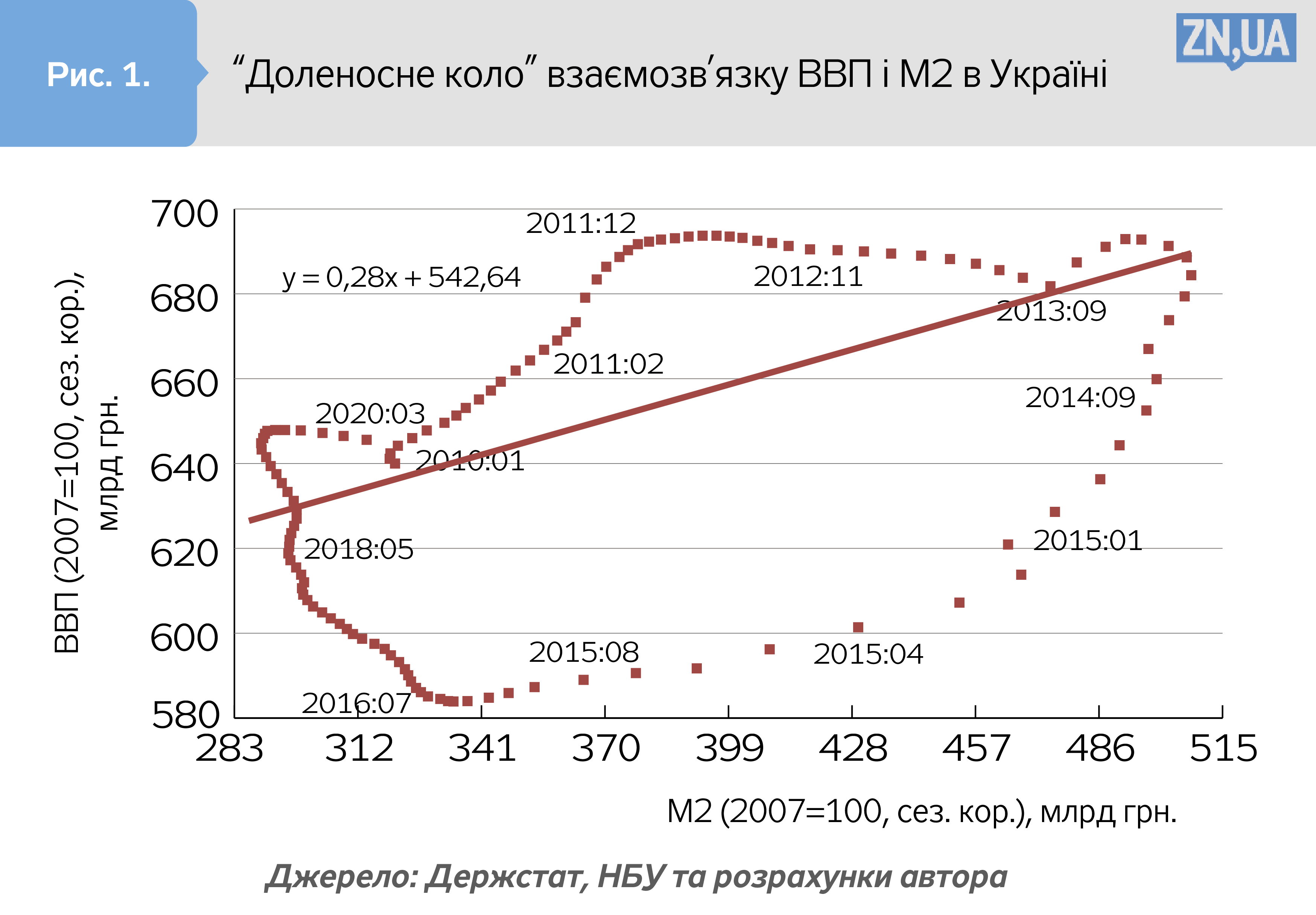 Згідно з відомим законом кількісного обміну (англ. — quantity theory of money), вартість виробленої продукції в економіці має відповідати кількості грошей, які з урахуванням швидкості їх обігу обслуговують усі товарообмінні операції. Якщо дистанціюватися від впливу цінового фактора та подати зазначену залежність графічно, отримаємо «доленосне коло», яким Україна кружляє впродовж останніх десяти років поспіль (див. рис. 1).