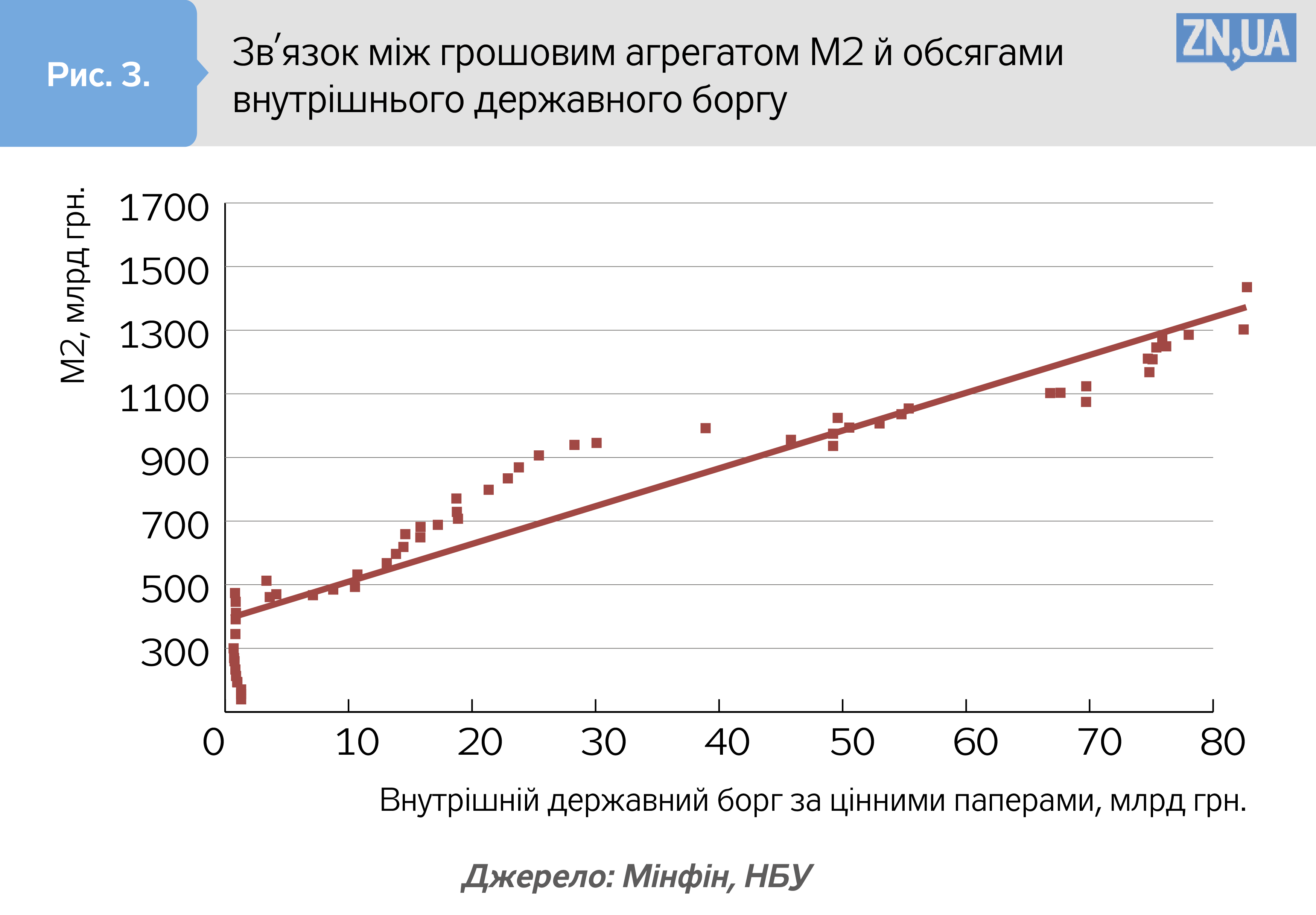Збільшення обсягу внутрішніх державних запозичень через збільшення дефіциту бюджету з використанням емісійних коштів центробанку називають монетизацією боргу, що є ключовим моментом взаємодії фіскальної та монетарної політик. Не вдаючись до детального викладення причинно-наслідкових зв’язків такої взаємодії, зі зростанням боргових апетитів бюджетного сектора дедалі більша частина розширення пропозиції грошової маси використовується для фінансування дефіциту бюджету. В результаті з певного моменту обсяги пропозиції грошей починають корелювати з обсягами внутрішнього державного боргу, що й спостерігається в Україні з початком кризи 2008–2009 років. Якщо звести на одному графіку два показники — грошовий агрегат М2 і обсяги внутрішнього державного боргу, то отримаємо доволі тісний і майже лінійний зв’язок. Залежність між зазначеними показниками слабшає у періоди відносної стабільності і збільшується під час криз, коли посилюється боргове навантаження на економіку (див. рис. 3).