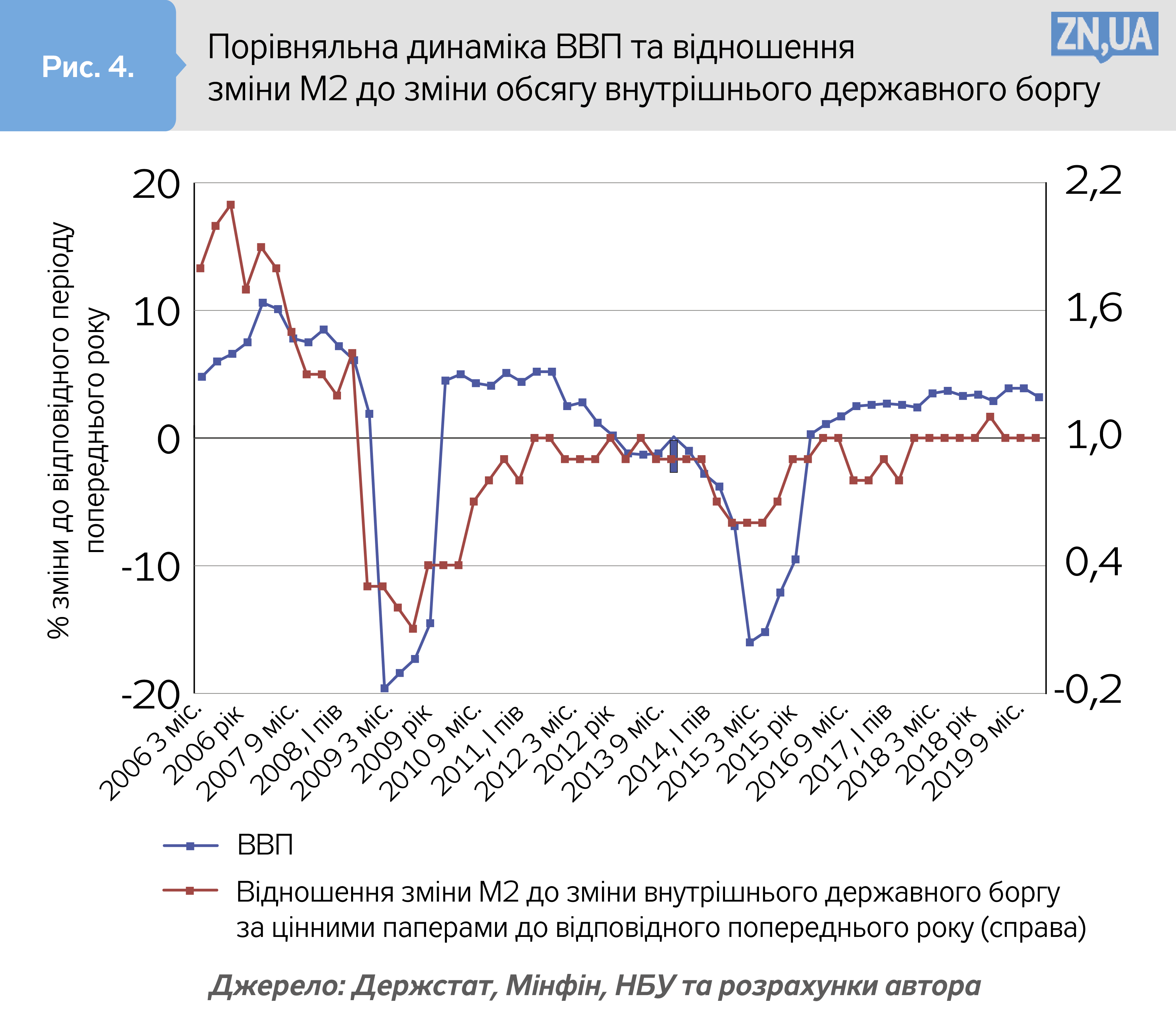Наявність зв’язку між пропозицією грошової маси та обсягами внутрішнього державного боргу також кореспондується з темпами ВВП. У періоди, коли грошова емісія центробанку використовується лише на потреби монетизації держборгу, економічне зростання сповільнюється. У такому разі повною мірою проявляється ефект витіснення. Якщо ж розширення пропозиції грошей в економіці перевищує обсяг збільшення державних боргових зобов’язань для фінансування дефіциту бюджету, то частина цих грошей може бути використана на інвестиційні цілі та прискорює динаміку реального сектора. Як видно з рис. 4, у періоди, коли відношення зміни агрегату М2 до зміни обсягу внутрішнього державного боргу перевищувало одиницю, економічне зростання в Україні прискорювалося. І навпаки, у періоди, коли вказане співвідношення дорівнювало або було менше одиниці, економічне зростання уповільнювалося.