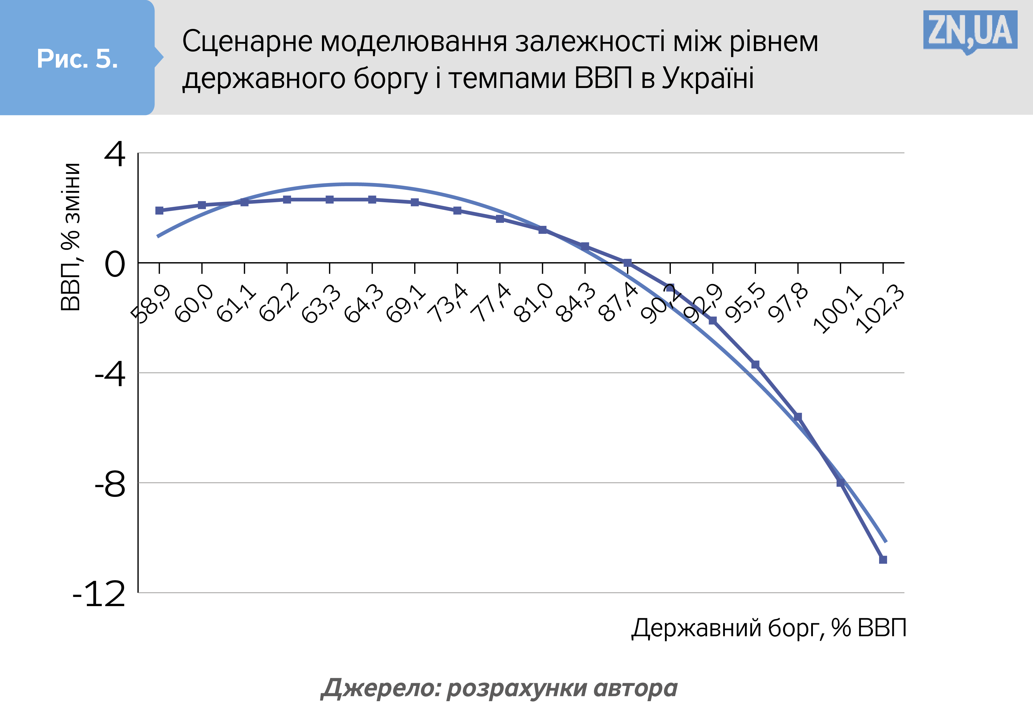Наведені орієнтири обсягу державних запозичень вказують на невеликий розмір фіскального простору (англ. — fiscal space) для здійснення маневру у встановлених межах державного боргу. Справа у тому, що відношення обсягів державного боргу до ВВП буде збільшуватися як унаслідок активного нагромадження боргового тягаря, так і через згортання обсягів виробництва. Результати виконаної сценарної оцінки дали змогу побудувати графік залежності між рівнем державного боргу і темпами ВВП в Україні на період 2016–2019 років. Розрахована точка кульмінації, тобто межа, за якої темпи економічного зростання зменшуються, відповідає рівню державного боргу у 63,8%. При цьому критична точка, за якої темпи економічного зростання набувають від’ємних значень, кореспондується з обсягом державного боргу на рівні 87,4%. Як видно з рис. 5, станом на середину 2020 року розвиток економіки України відбувається у фазі, яка перебуває поблизу точки кульмінації, залишаючи обмаль фіскального простору для маневру. Тому на нинішньому етапі з метою протидії наслідкам розгортання кризових процесів і для прискорення темпів відновлення економіки уряду України варто оперувати лише в межах невеликих обсягів збільшення державних запозичень з фокусуванням на ефективних інвестиційних проєктах з високою капітальною віддачею.