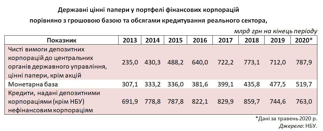 Вказане пояснюється зростанням попиту Міністерства фінансів України на тимчасово вільні грошові залишки для фінансування дефіциту бюджету. Як результат, завдяки прояву відомого ефекту витіснення обсяги державних цінних паперів у портфелі банків ще 2014-го перевищили монетарну базу й майже зрівнялися в травні 2020-го (787,9 млрд грн) з обсягами кредитування реального сектора (763,0 млрд). Наразі виразною є тенденція до зменшення кредитування реального сектора на тлі збільшення обсягів внутрішніх державних запозичень (див. табл.).