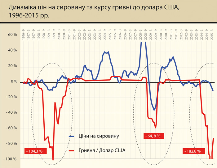 Поверхневого погляду достатньо, щоб зрозуміти: за останні 19 років усі (!) валютні кризи в Україні відбувалися при падінні світових цін на сировину. Її економіка й валюта не змогли протистояти жодній (!) сировинній рецесії. Причому обидві тримаються на ногах тільки (!) при зростанні експортних цін. А найменший протяг на сировинних ринках відправляє їх у реанімацію, потребуючи термінової вентиляції валютних резервів.