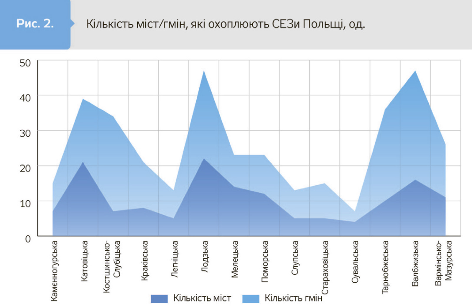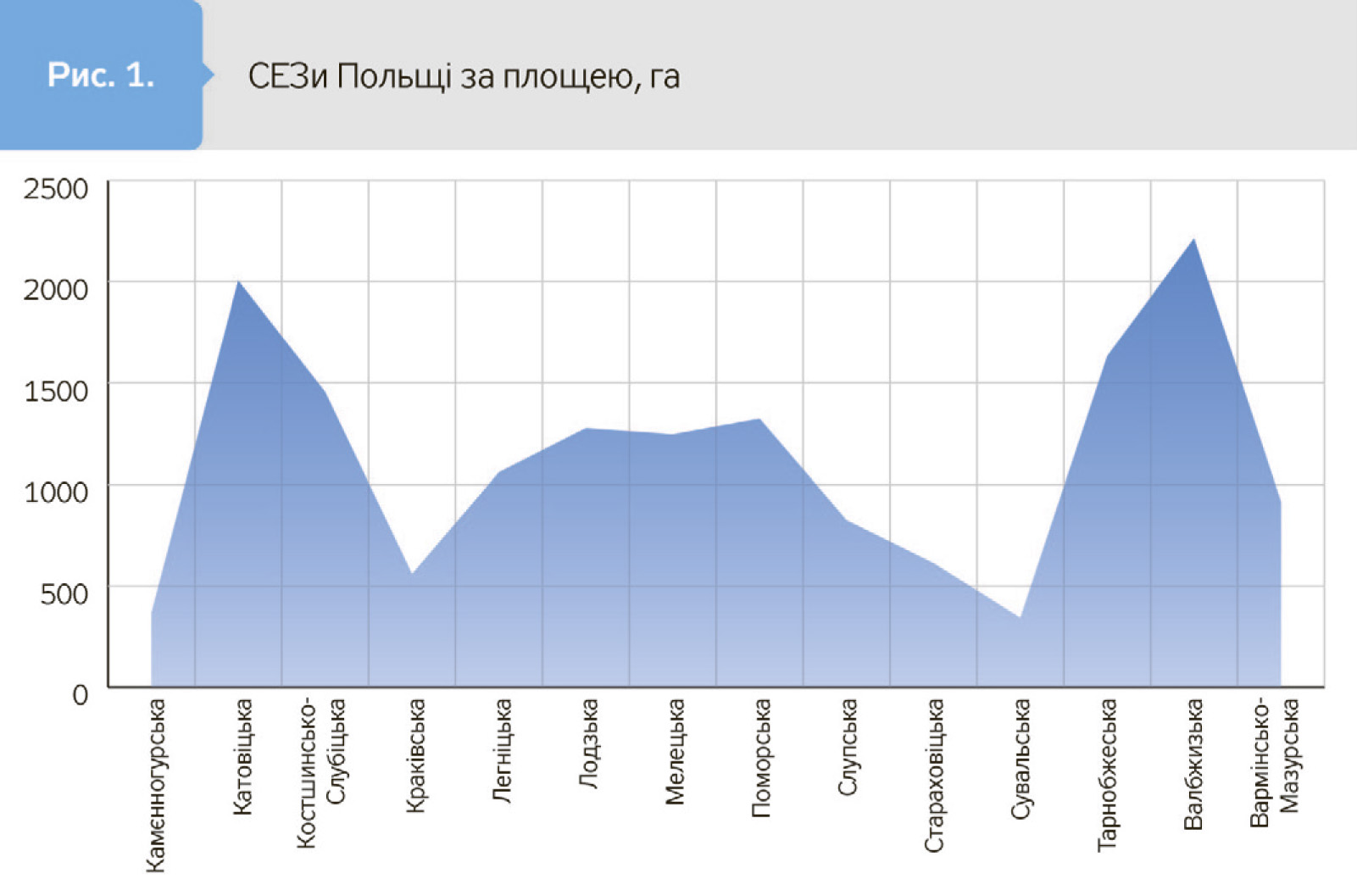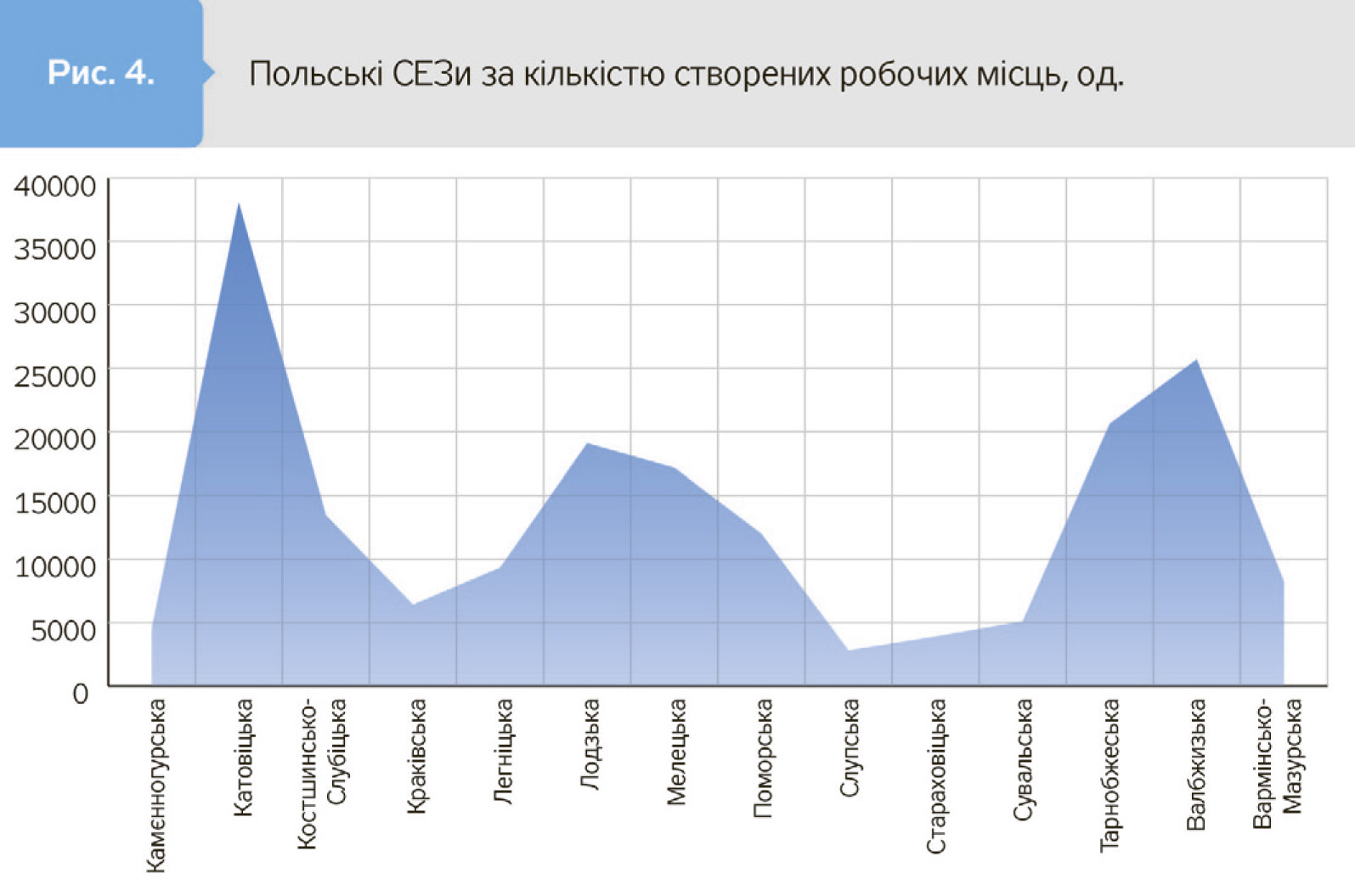 Через рік, 1996-го, було створено ще дві економічні зони - Катовіцьку і Сувальську, інші десять - 1997-го, а останню - Поморську - у 2001 р. Кожна з цих 14 СЕЗ є унікальною, відрізняється загальними характеристиками (рис. 1, 2), спеціалізацією та результатами діяльності (рис. 3, 4).