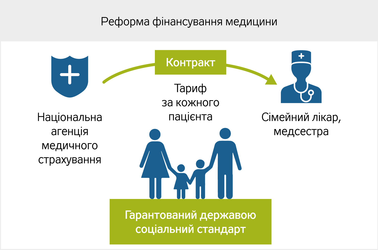Сімейні лікарі будуть забезпечувати первинну діагностику, за необхідності направляти на додаткові дослідження й до вузьких фахівців, а крім іншого, видавати довідки в дитячий садок, школу, басейн. Лікарі первинної ланки зможуть вибрати будь-яку організаційну форму роботи - ФОПи, поліклініки, амбулаторії і ЦМСД. Якщо сімейний лікар вирішить почати приватну практику, оплата надходитиме на його рахунок прямо, минаючи посередників. Технічним оператором перерахування бюджетних коштів стане спеціальне страхове агентство. Процедура ліцензування медичних практик буде прискорена, будівельні норми й санітарні правила (ДБН і СанПіН) для відкриття медичних практик будуть спрощені й гармонізовані з європейським законодавством. Буде скасована паперова звітність для лікарів первинної ланки. Їхня праця оплачуватиметься за нормативом (див. рис.) залежно від кількості укладених лікарем угод і дотримання медичних протоколів лікування й діагностики.