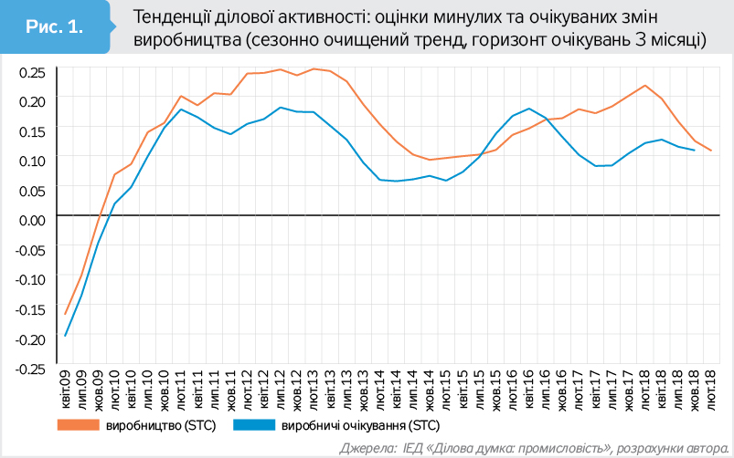 Аналіз тенденцій, побудованих на основі сезонно очищеного індексу змін обсягів виробництва та індексу очікуваних змін обсягів виробництва, свідчить про уповільнення темпів зростання в другій половині 2018 р. (див. рис. 1 на 8-й стор.). Результати двох останніх замірів ділової думки в 2018-му (в липні та жовтні) при переведенні в сезонно очищений тренд знову демонструють уповільнення. В абсолютних показниках ситуація виглядає краще.