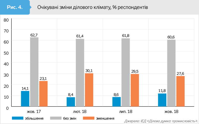 У свою чергу очікування змін ділового клімату демонструють іншу тенденцію (див. рис. 4). Початок року характеризувався зростанням оптимізму щодо поліпшення ділового середовища. У квітні 2018 р. індекс очікуваних змін ділового середовища збільшився на 13 п.п. порівняно з лютим 2017-го. Це відбулося тоді за рахунок збільшення частки тих, хто очікує позитивних змін (з 19,7 до 25,8%), і водночас зменшення частки тих, хто очікує погіршення ділового середовища (з 12 до 7,2%). Разом із цим 52,6% керівників підприємств повідомили, що не очікують змін ділового середовища впродовж наступного півріччя. В липні 2018 р. індекс очікуваних змін ділового середовища практично не змінився, а от уже у жовтні його значення скоротилося через одночасне зменшення частки оптимістів з 29,5% у липні до 27,6% у жовтні та зростання частки песимістів з 8,6 до 11,8% відповідно.