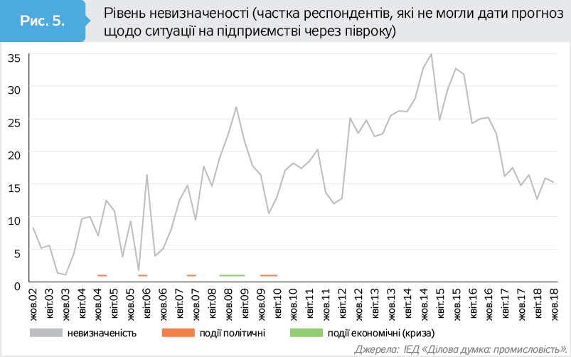 У наших дослідженнях індикатором невизначеності є два прості показники: частка опитаних, які не змогли спрогнозувати зміни фінансово-економічної ситуації на підприємстві в піврічній перспективі, та частка опитаних, що не знають, в якому напрямку зміниться ділове середовище через півроку. За результатами "Ділової думки", в українській економічній історії невизначеність зростала напередодні та залишалася високою ще принаймні квартал після президентських виборів, також суттєве зростання невизначеності спостерігалося під час економічної кризи наприкінці 2008-го - на початку 2009 р. Наступний випадок зростання невизначеності зафіксовано наприкінці 2010 р. (що очевидно спричинено економічною політикою уряду Азарова, згадаємо "податковий" майдан як реакцію на можливе посилення податкового тиску на малий і середній бізнес). Надалі економічне середовище характеризується високим рівнем невизначеності. Події осені 2013 р. і подальші події, спричинені розгортанням російської військової агресії проти України, лише подовжили ситуацію невизначеності для українського бізнесу. Лише з середини 2016-го середовище стає більш прогнозованим, і частка тих, хто не може визначитися з економічною ситуацією на підприємстві через півроку, поступово зменшується. Така тенденція тривала до липня 2018 р. А вже за результатами опитувань липня та жовтня 2018-го частка тих, хто не зміг визначитися ні щодо економічної ситуації на підприємстві, ні щодо змін бізнес-клімату через півроку, збільшується. Хоча обидва показники ще набагато нижчі, ніж у 2010–2017 рр. Зокрема, частка керівників підприємств, які не змогли дати прогноз на наступні шість місяців щодо фінансово-економічної ситуації на підприємстві, в жовтні становила 15,3%, у липні - 15,9, збільшившись із 12,7% у квітні 2018-го. Для порівняння, в жовтні 2015 р. 32,7% опитаних не могли зробити прогноз на шість місяців.