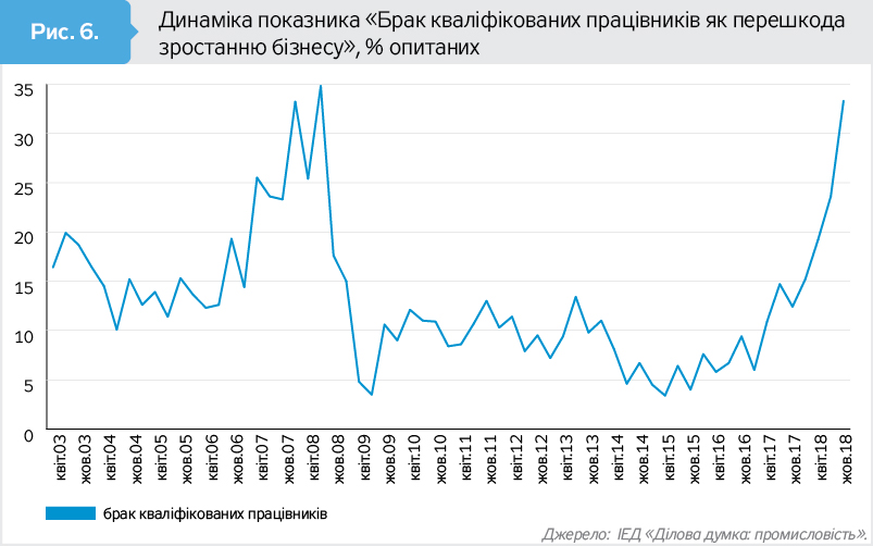 В рейтингу перешкод брак кваліфікованих кадрів за результатами опитування жовтня 2018 р. посів п'яту сходинку. Кожен третій з опитаних вважає, що це перешкода зростанню виробництва на підприємстві. Важливість цього показника стрімко зростає з лютого 2017-го. На думку опитаних керівників підприємств, існують суттєві труднощі з пошуком як кваліфікованих працівників, так і некваліфікованих. Традиційно знайти кваліфікованих працівників важче, ніж некваліфікованих. Індекс труднощів при пошуку кваліфікованих працівників у жовтні 2018 р. становить 0,52, індекс труднощів пошуку некваліфікованих працівників дорівнює 0,37 по шкалі від -1 (легко) до +1 (важко).