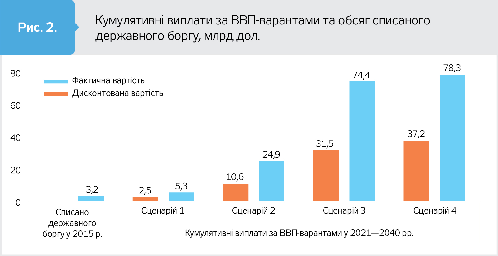Результати модельних розрахунків виплат за ВВП-варантами вражають. Навіть за першим сценарієм обсяг майбутніх виплат майже вдвічі перевищить суму списаного у 2015 р. боргу. Прогресія виплат за ВВП-варантами посилюватиметься при збільшенні річних темпів приросту реального ВВП. Уже в другому сценарії (із середнім темпом ВВП 4,3%) обсяг виплат становитиме 25 млрд дол., в третьому - 74 млрд, у четвертому - 78 млрд дол. (див. рис. 2).